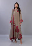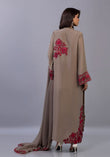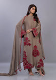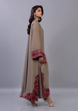 Exude an air of refined grace in this stunning taupe ensemble, a perfect fusion of muted elegance and fiery artisanal detail. The long shirt is meticulously crafted with a clean band collar and a hidden placket, serving as a sophisticated canvas for the bold, crimson-red embroidery that anchors the hem with majestic Suzani motifs. Intricate floral sprays adorn the shoulder and back, while the wide statement cuffs feature dense, traditional thread-work that adds a layer of heritage charm. Completed with a matching pants and a lightweight dupatta finished with a delicate red lace.