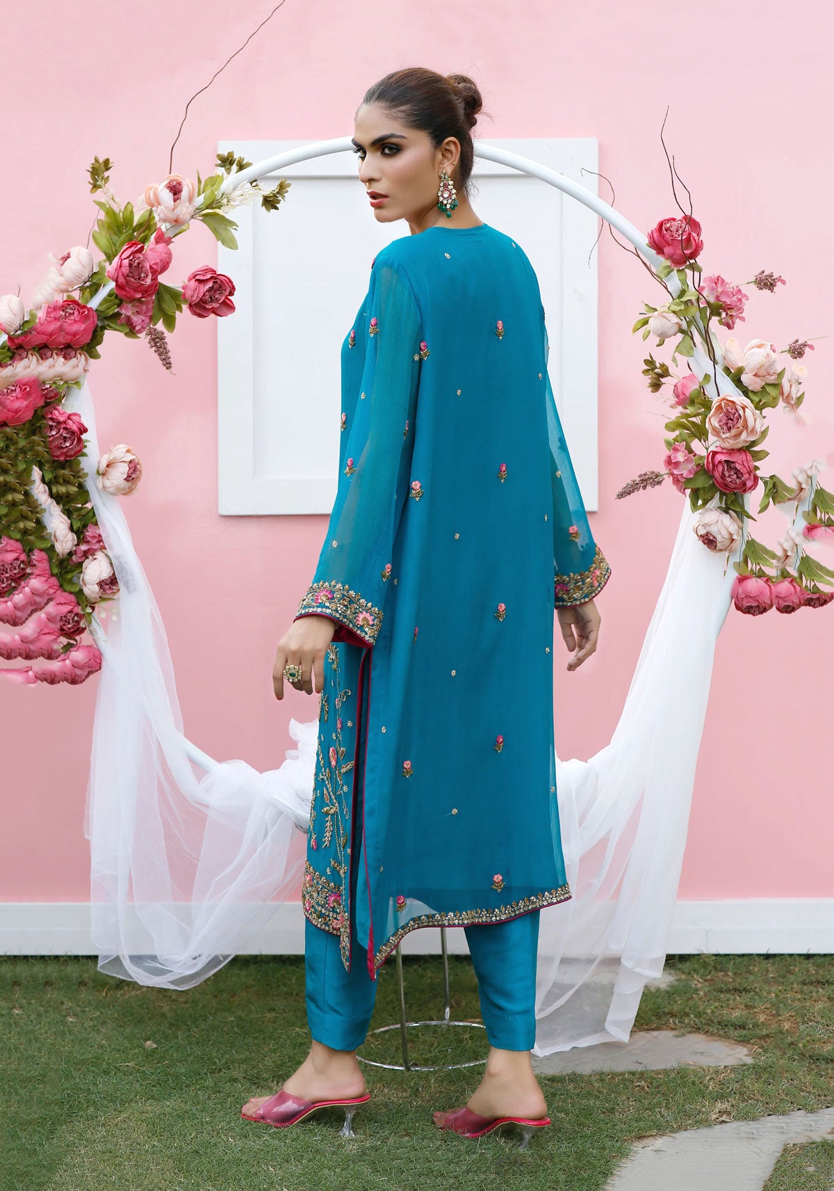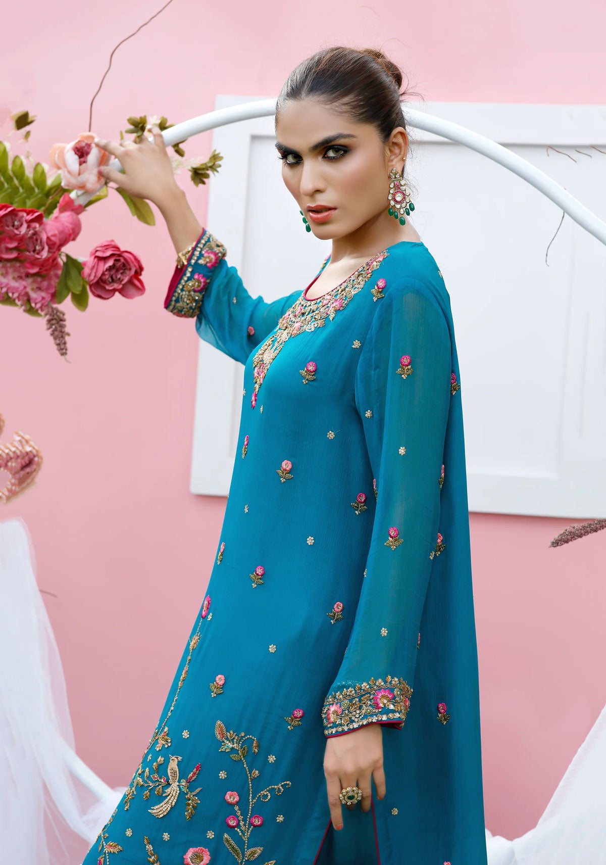 The Nure Hayat ensemble exudes timeless elegance featuring fine quality needle craft to create looks that are steeped in old-world charm. Tailored from pure chiffon and artfully embroidered with vivid resham accents following a tree of life scene with sporadic flora fauna, this piece is a perfect addition to your festive armoire. It is paired with pure raw silk pants and a richly contrasting chiffon dupatta, beautifully worked with dispersed kamdani chan and motifs, finished with kamdani borders.