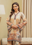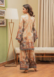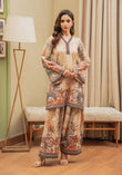 Make a subtle yet striking statement in this original Shamaeel print co-ord set, beautifully rendered in soft peach and terracotta tones. The relaxed-fit kurta features a deep V-notch neckline accented with a contrast border, complemented by full-length sleeves and a hem adorned with botanical print. Paired with Farshi shalwar that echo the same rich detailing, this two-piece ensemble blends comfort with quiet sophistication. Crafted in a soft, breathable fabric, for all-day wear, perfect for Eid, casual outings, daytime events.