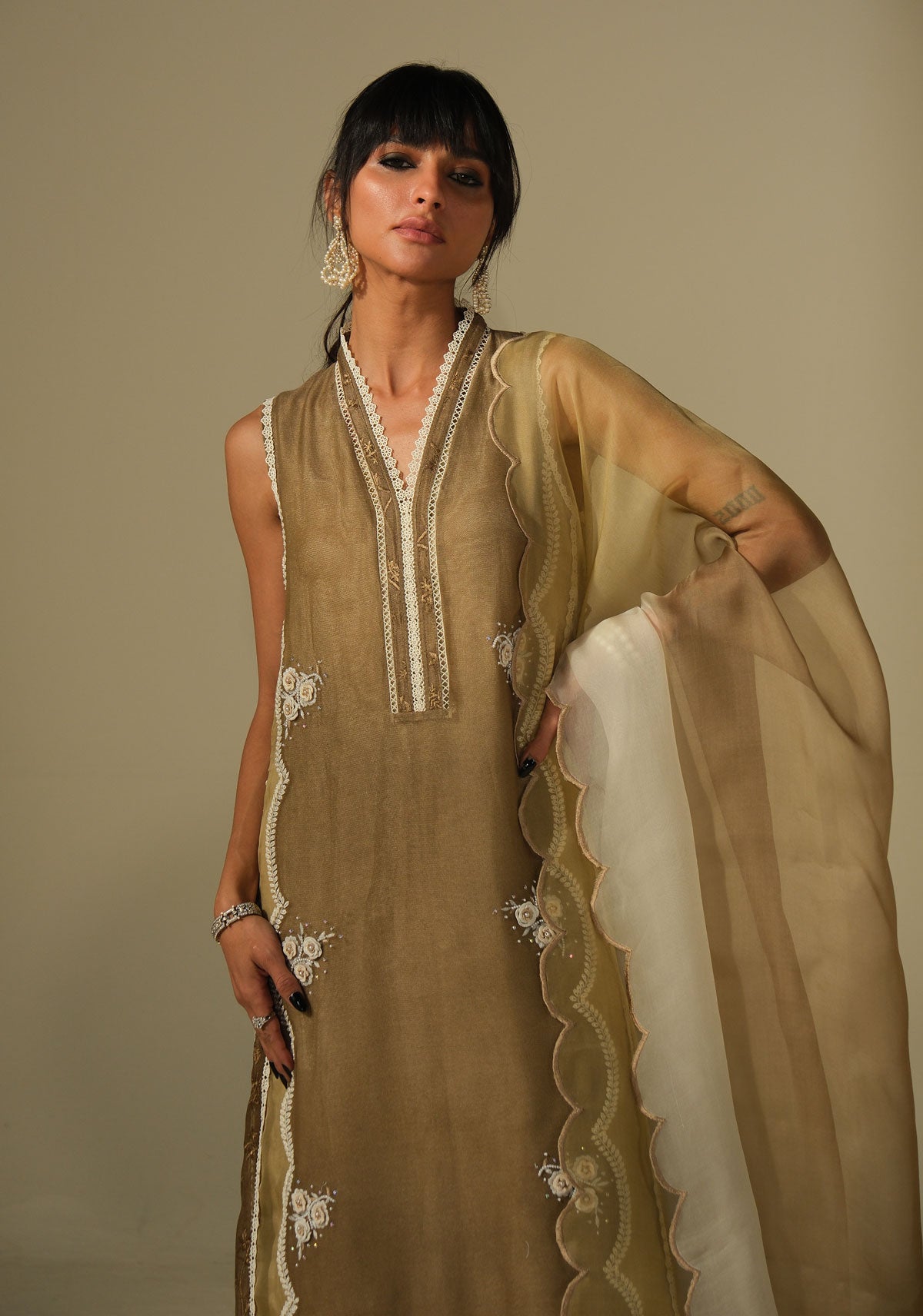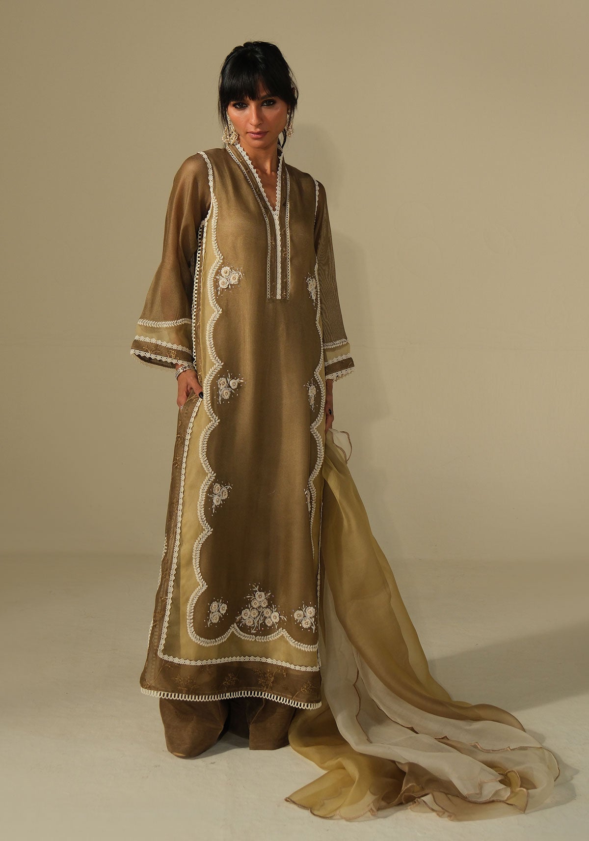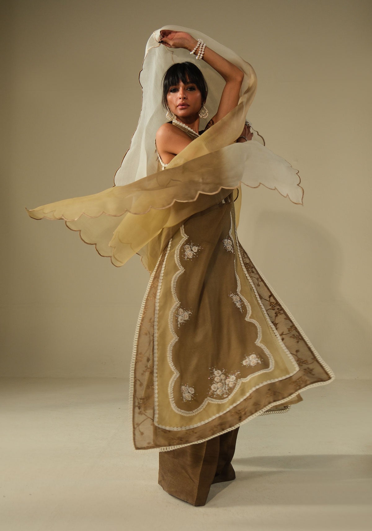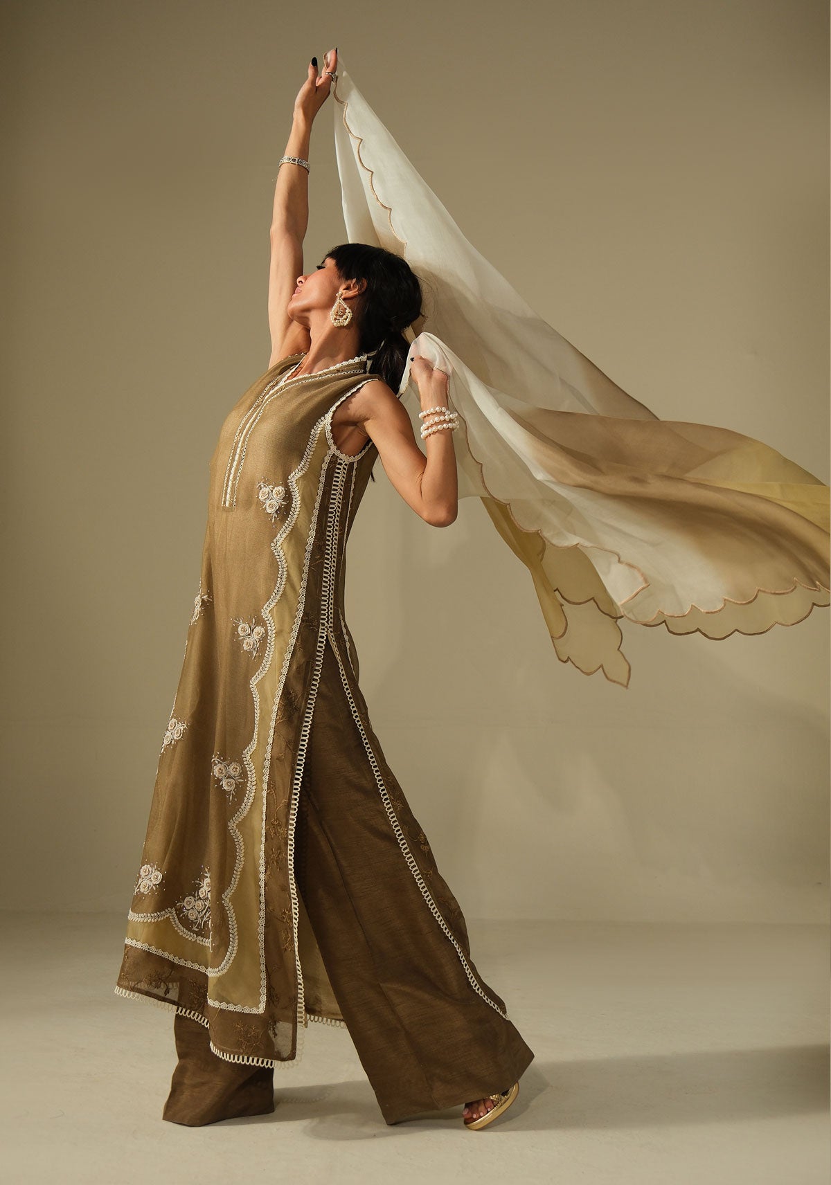 Look sophisticated in this super elegant ensemble. FH signature French knot florals in ivory and cream on a toffee and caramel base. Comes with wide leg silk pants.