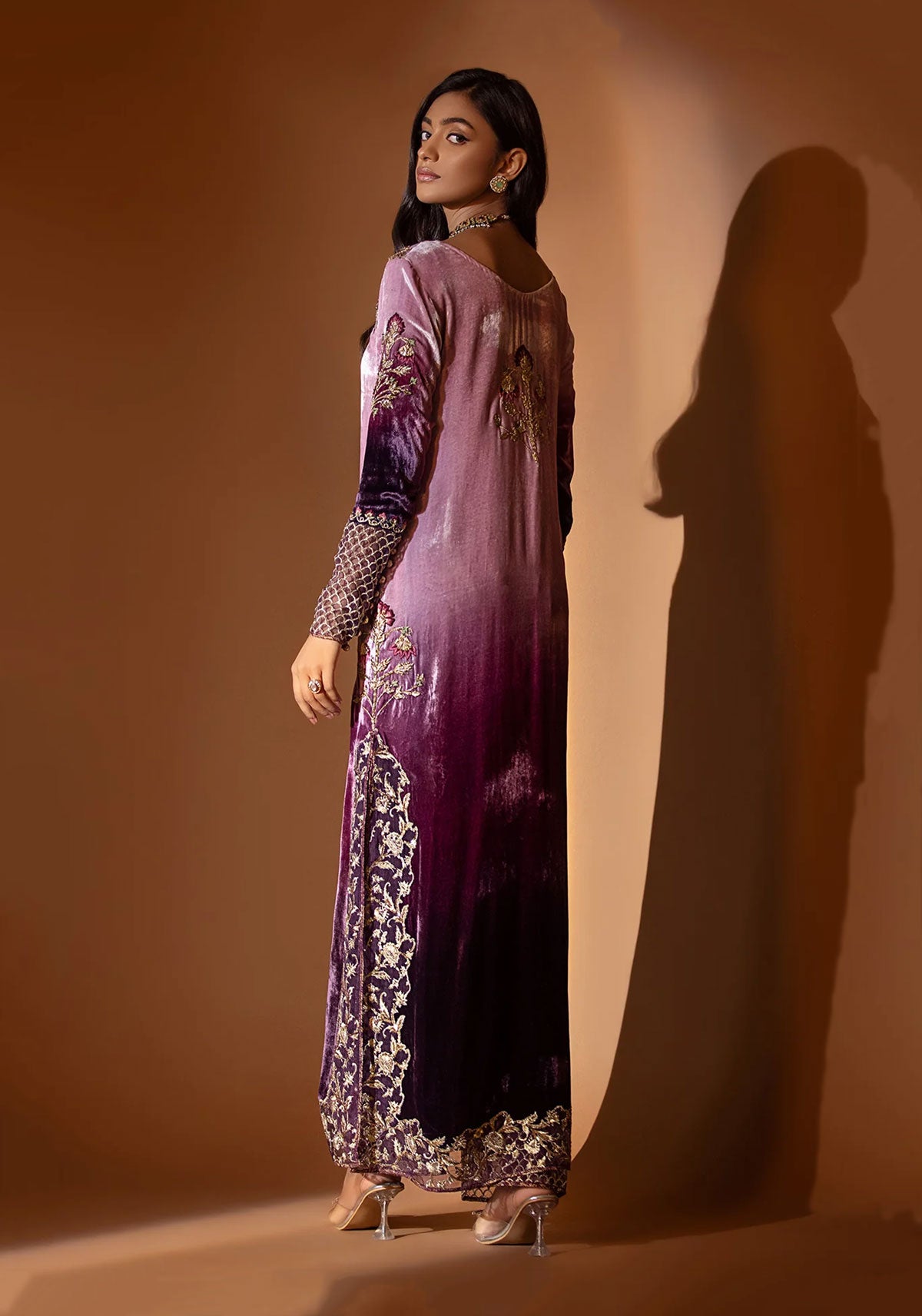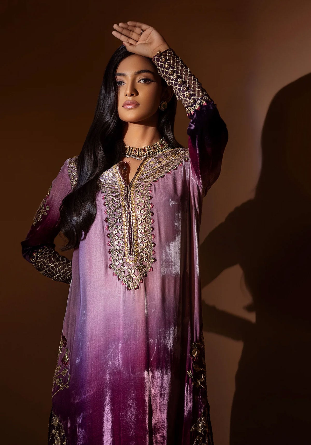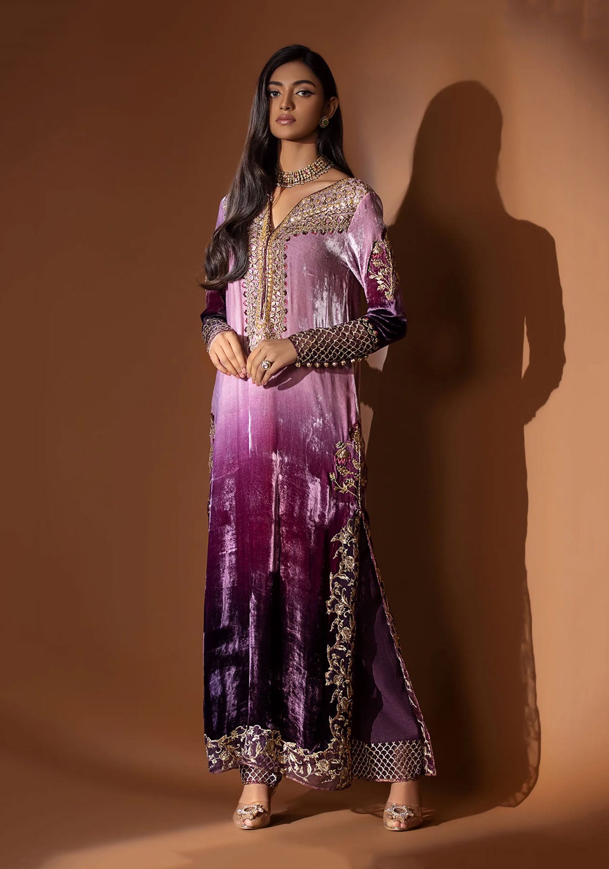A two toned velvet long shirt with gota and resham embroidery on the neckline. With side slits and hem finished in tilla embroidered appliques.