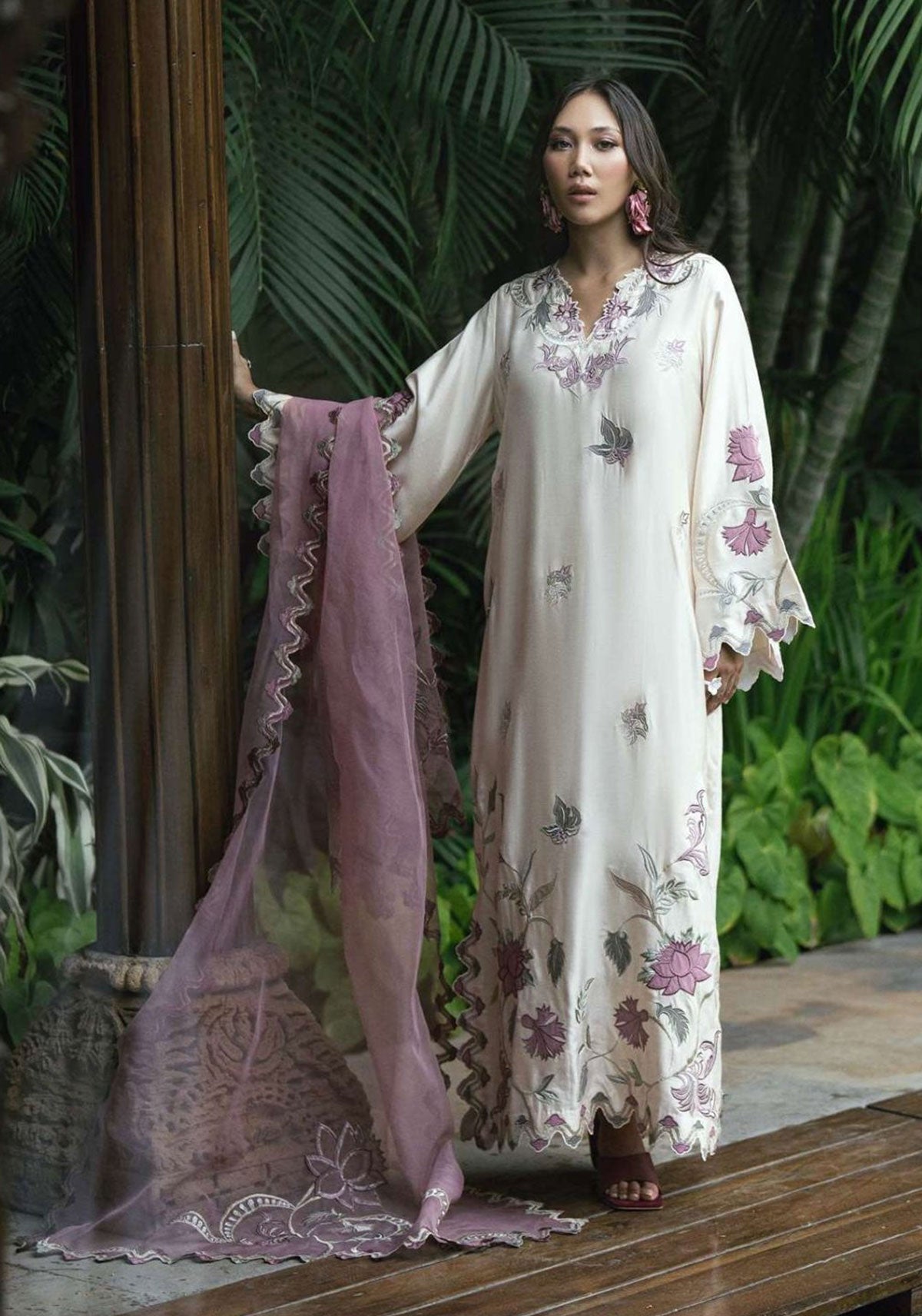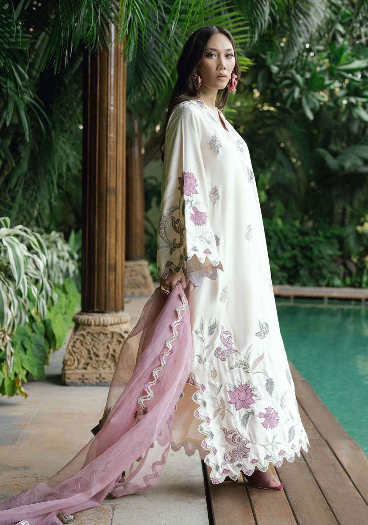 A stunning long shirt fully adorned with intricate appliqué work, showcasing elegant design and fine craftsmanship. Paired with Qlot pants and a beautifully detailed dupatta featuring scallop-style machine embroidery, this ensemble is a perfect blend of sophistication and contemporary flair—an ideal choice for refined festive dressing.