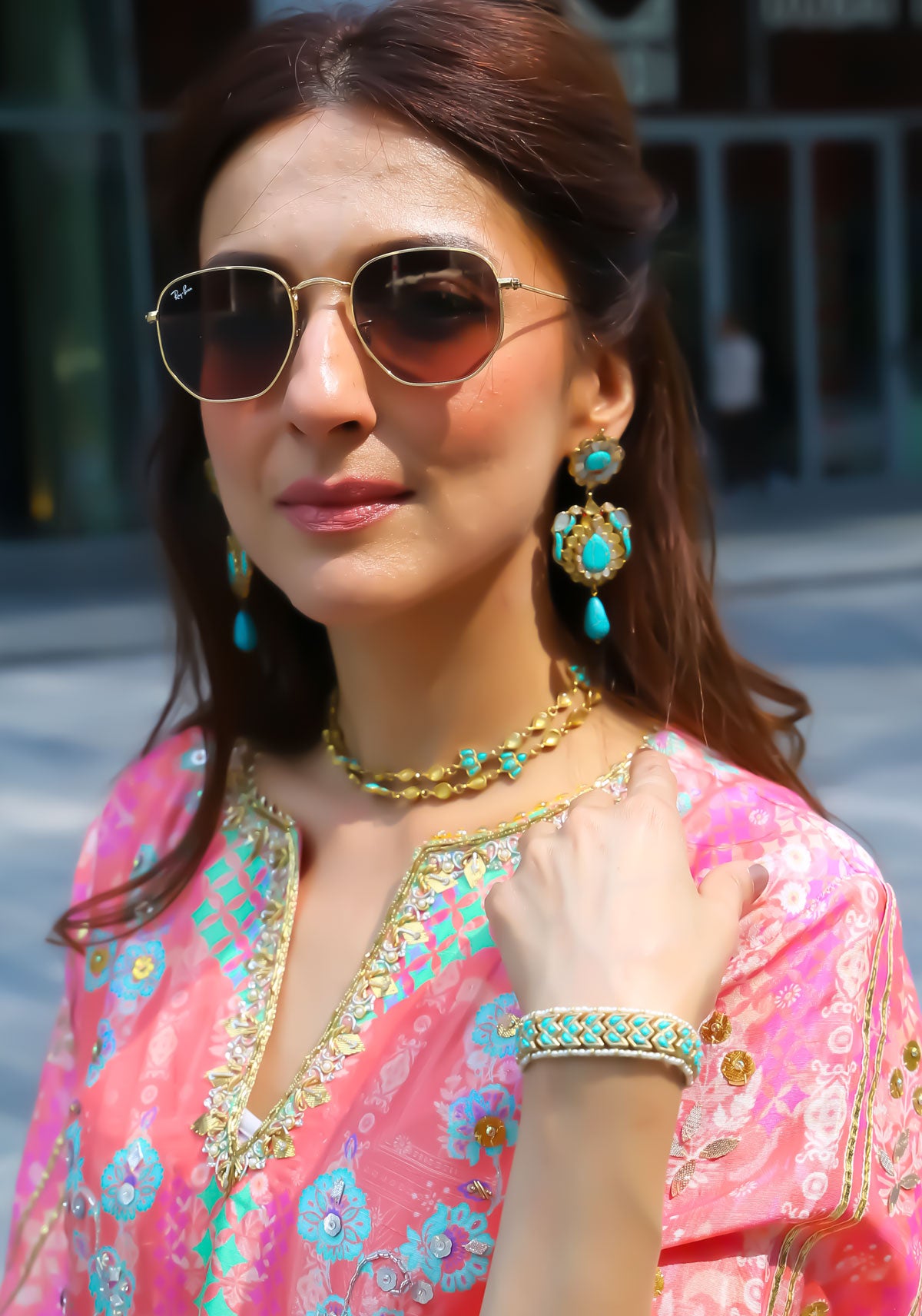 Gold-toned piece featuring small, pearl-shaped champagne-hued stones beads, and turquoise-colored beads birds.