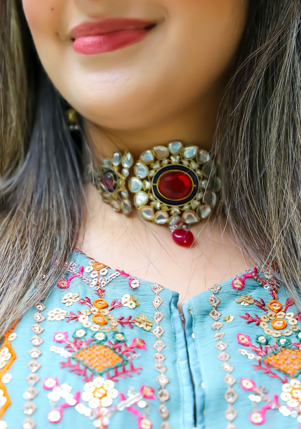 Drape yourself in regal splendour with the Noor-e-Ruby Kundan Choker, a masterpiece that embodies the timeless elegance of royal heritage. This exquisite choker showcases two grand ruby-red stones encircled by a halo of handcrafted polki kundan settings, reflecting light with a divine brilliance. The deep scarlet hues are beautifully contrasted with pearlescent kundan petals, creating an opulent balance of color and craftsmanship.