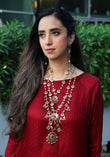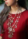 Make a bold yet elegant statement with this intricately designed layered necklace set. Crafted in a silver-tone finish, the piece features cascading strands of tear drop details and ornate floral motifs accented with delicate stones. The multi-layered silhouette adds depth and movement, creating a striking look that elevates both traditional and modern outfits.