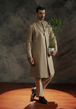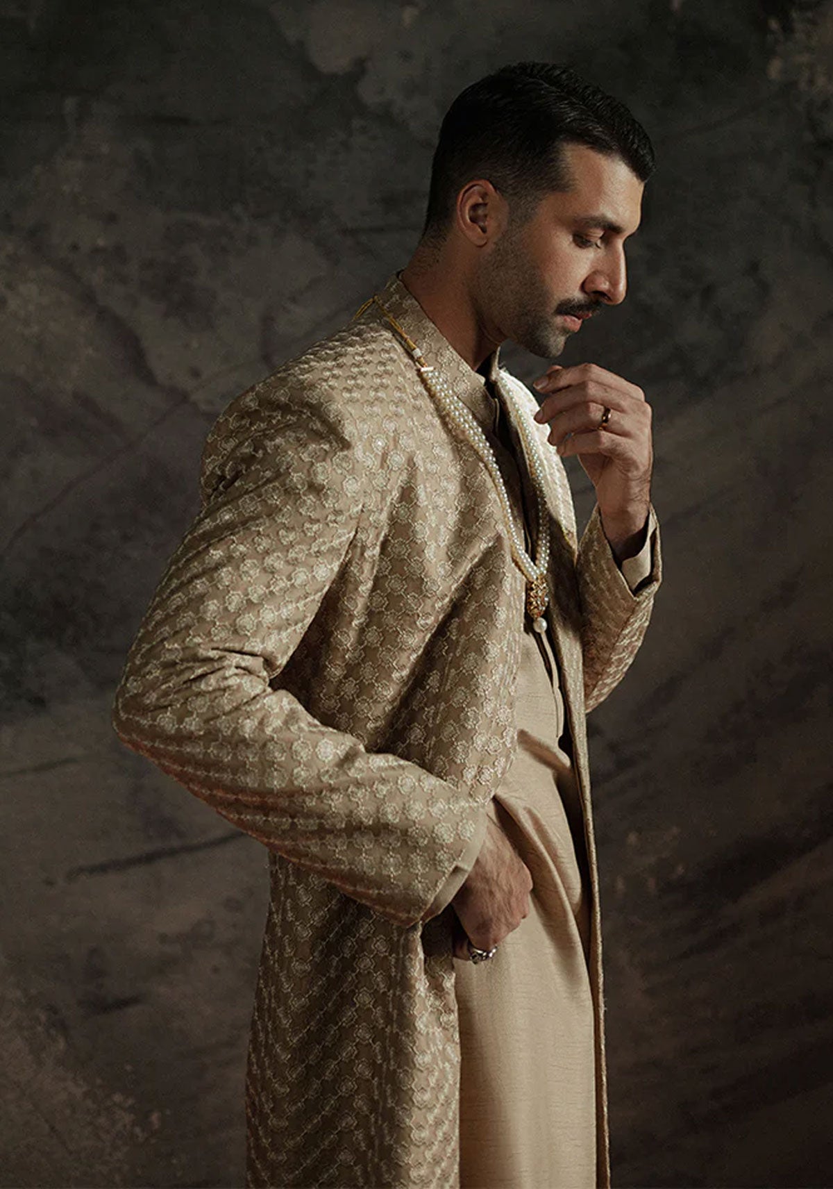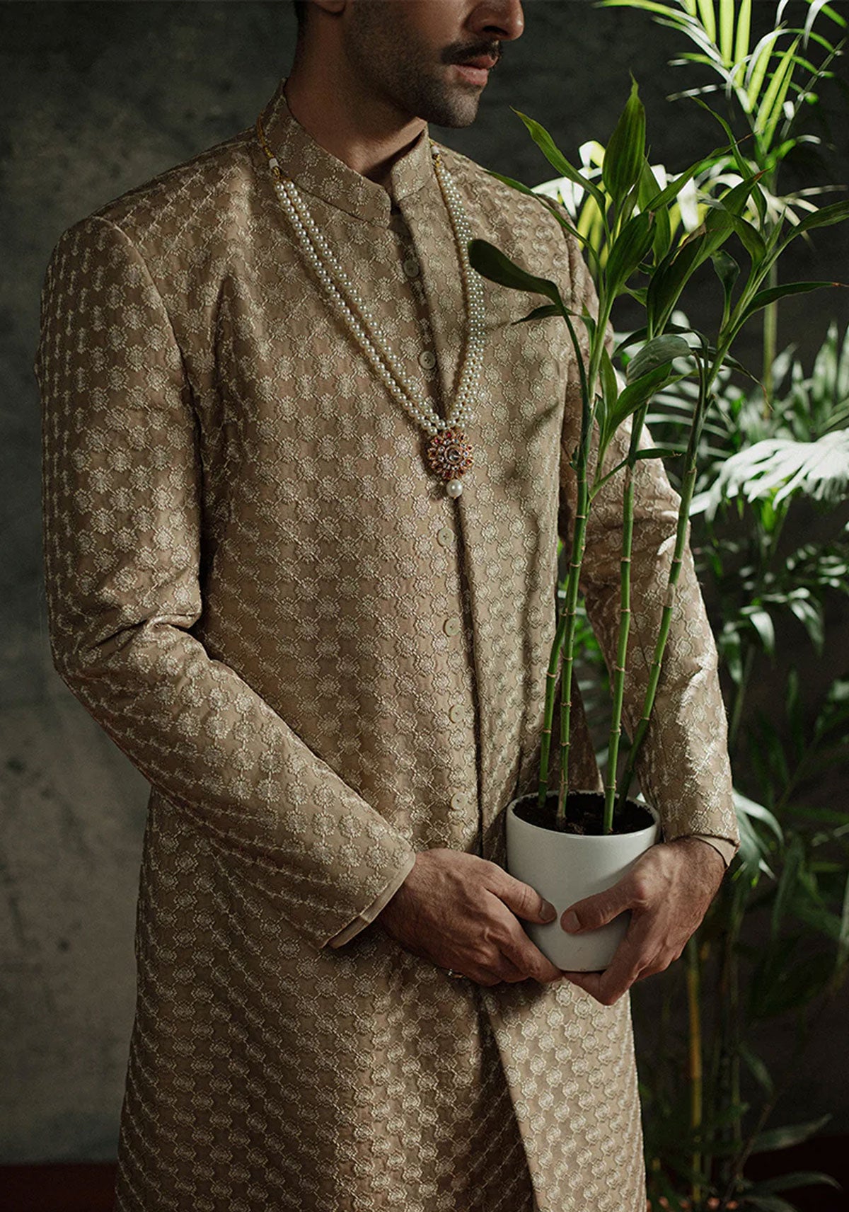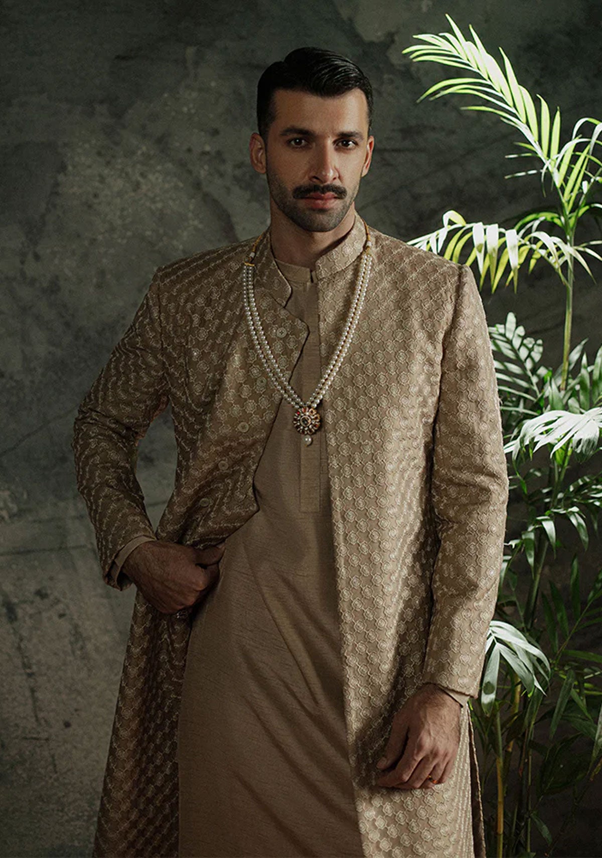 'A bronze double layered sherwani in an embroidered organza fabric and raw silk base, further detailed with sequins and resham renderings.