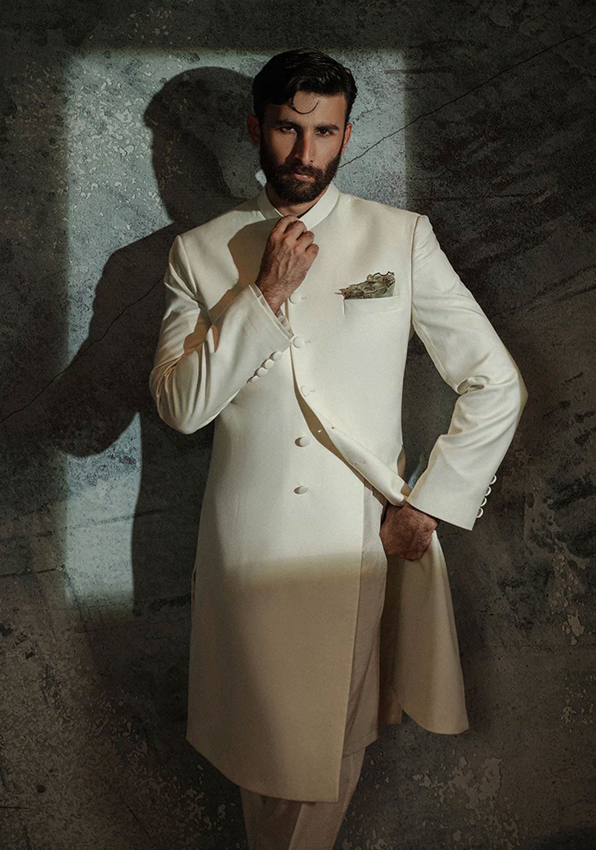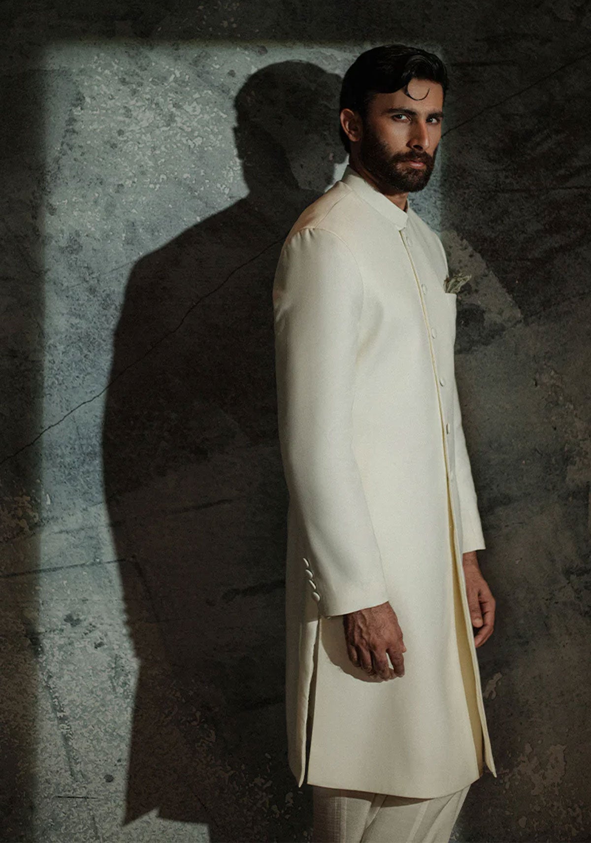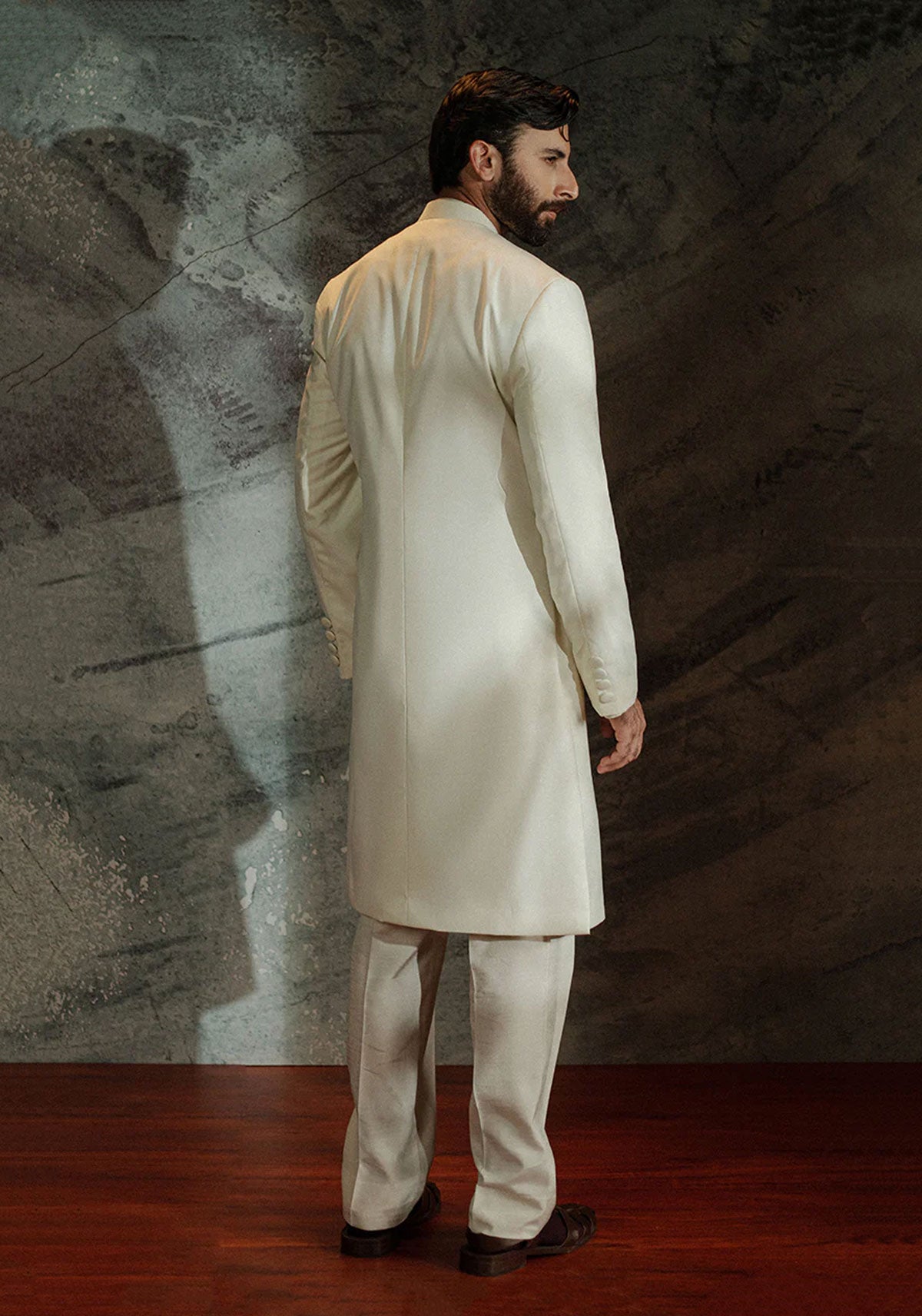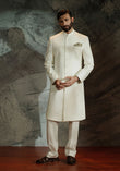 An off-white classic quaid style sherwani detailed with a band in a premium suiting fabric.