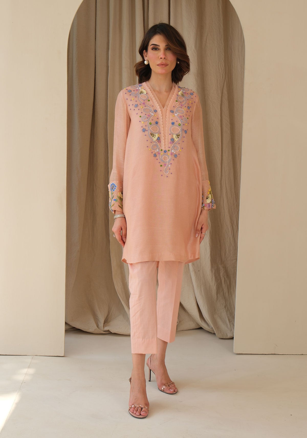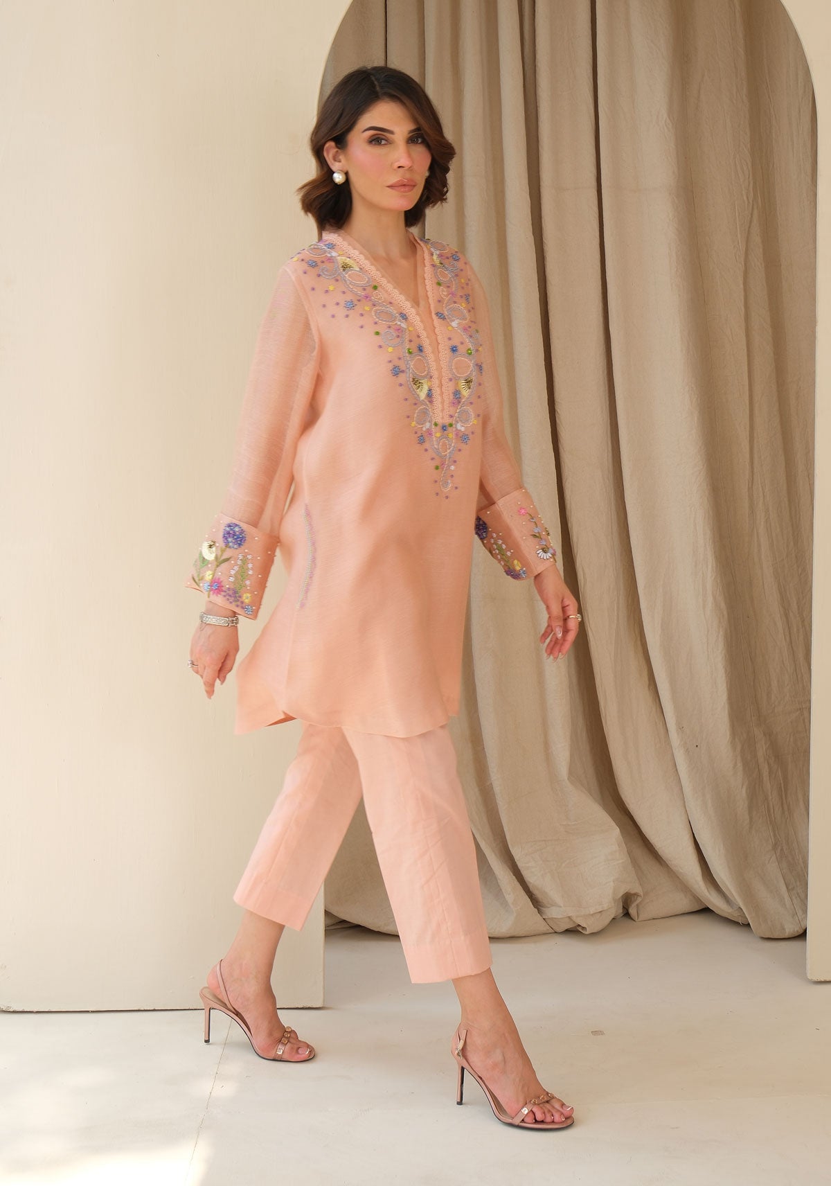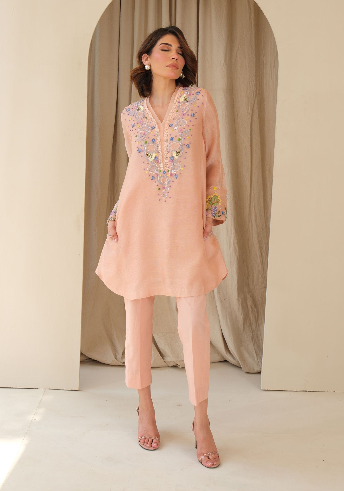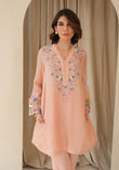 In the softest blush cotton net, this piece blooms with hand-embroidered whimsical 3D florals. The addition of pockets lends a coolness to this dreamy summer statement, rich in detail and delicate charm. Comes with cotton pants.