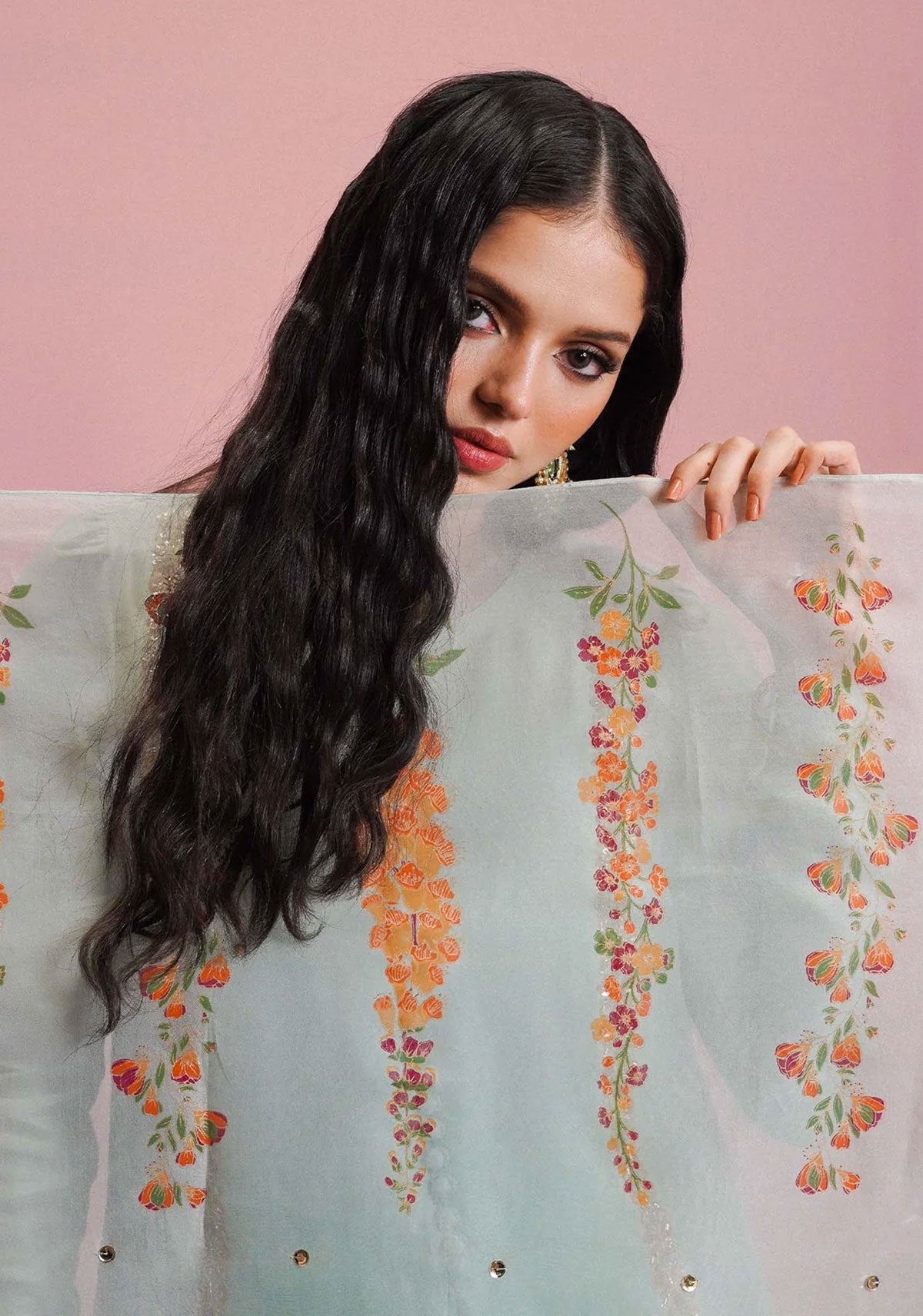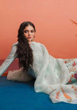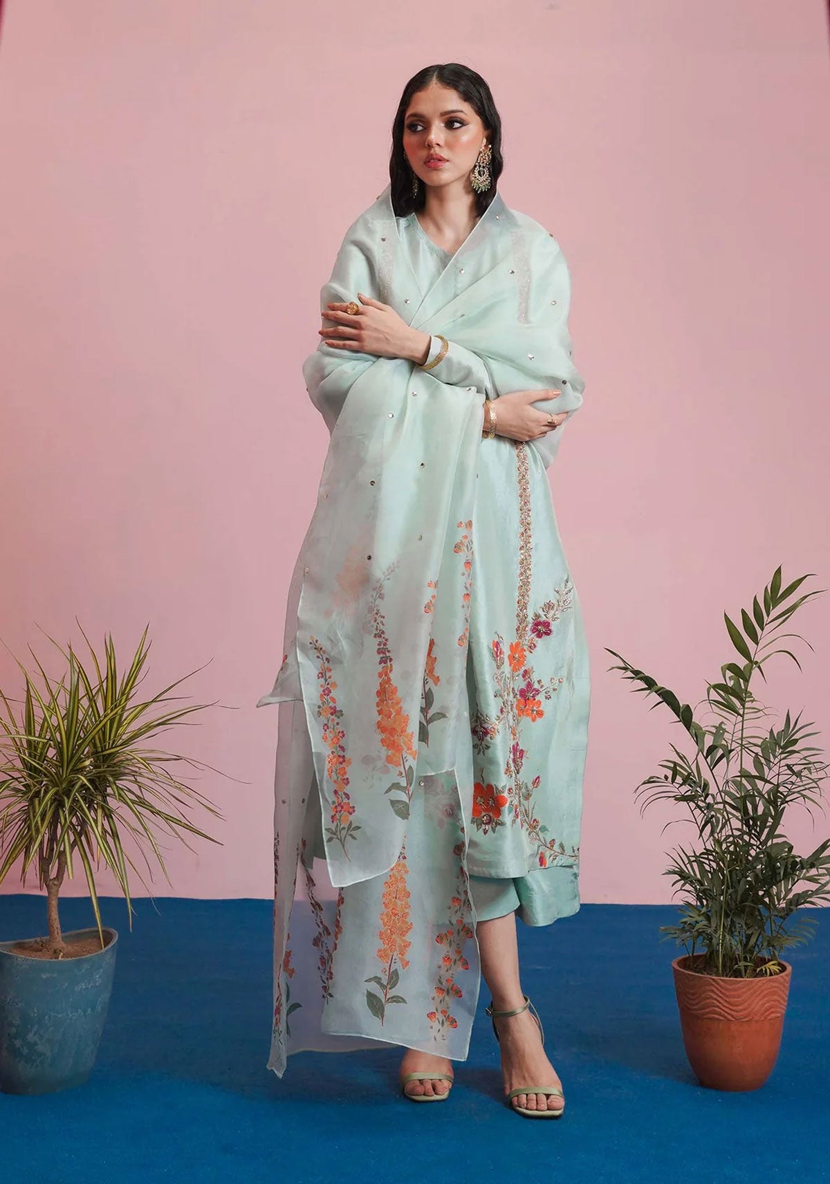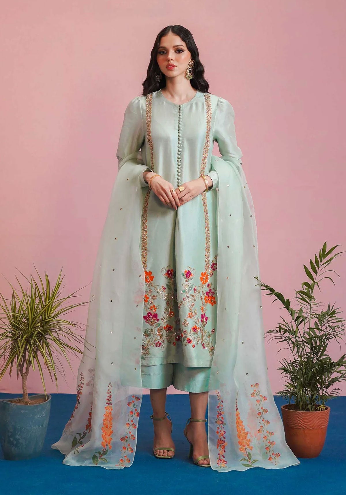 The raw silk ice blue ensemble adorned with gold sequins, and pink, orange and gold bungle beads with detailing of pita work and neckline descends with loop buttons and a center pleat. It is paired with the culottes and a printed organza dupatta with golden sequins sprayed all over it which exudes classic charm.