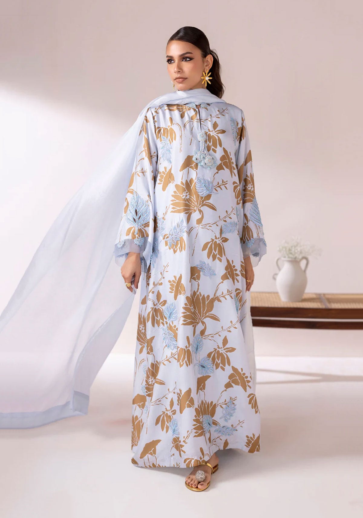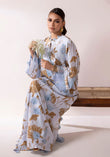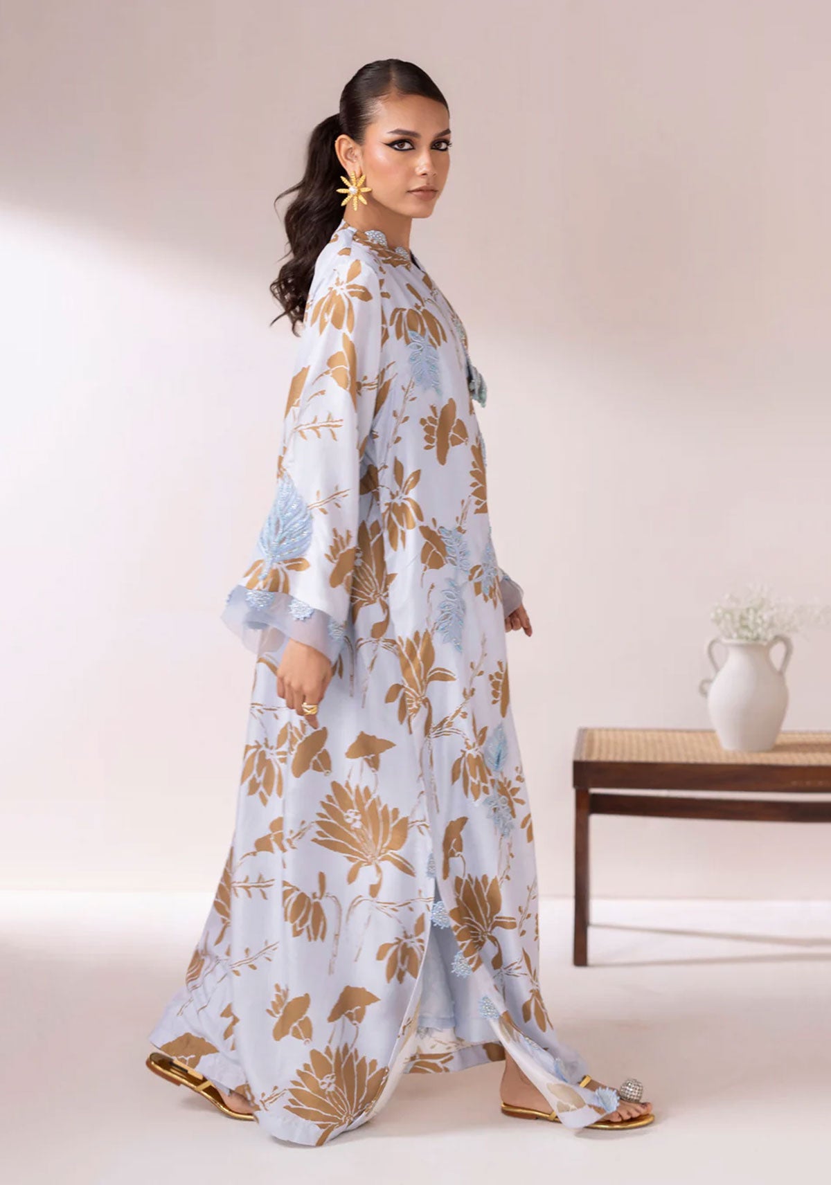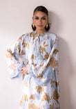 Yaleh, like a gentle breeze over a powder-blue canvas blooming with brown botanical motifs, is crafted from printed silk. Made with soft, 60-gram pure raw silk, it offers an effortless, summery drape.