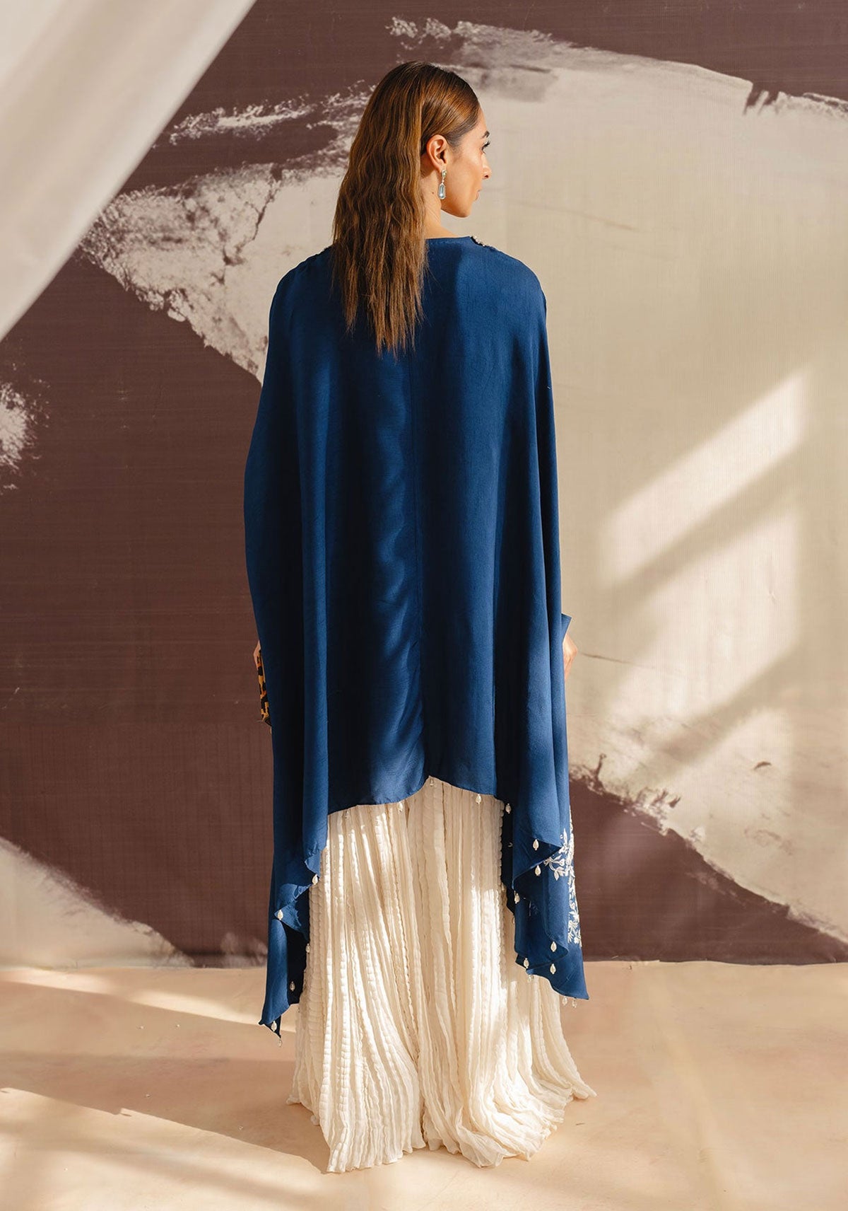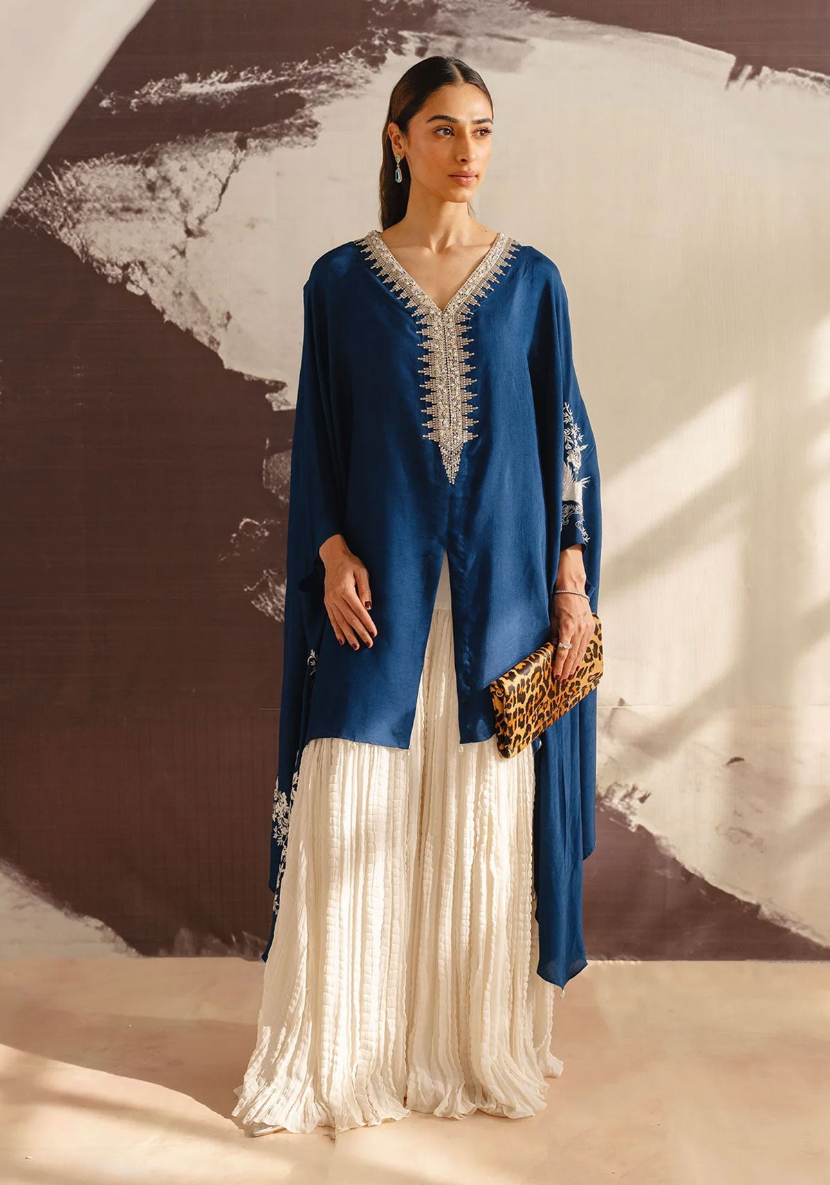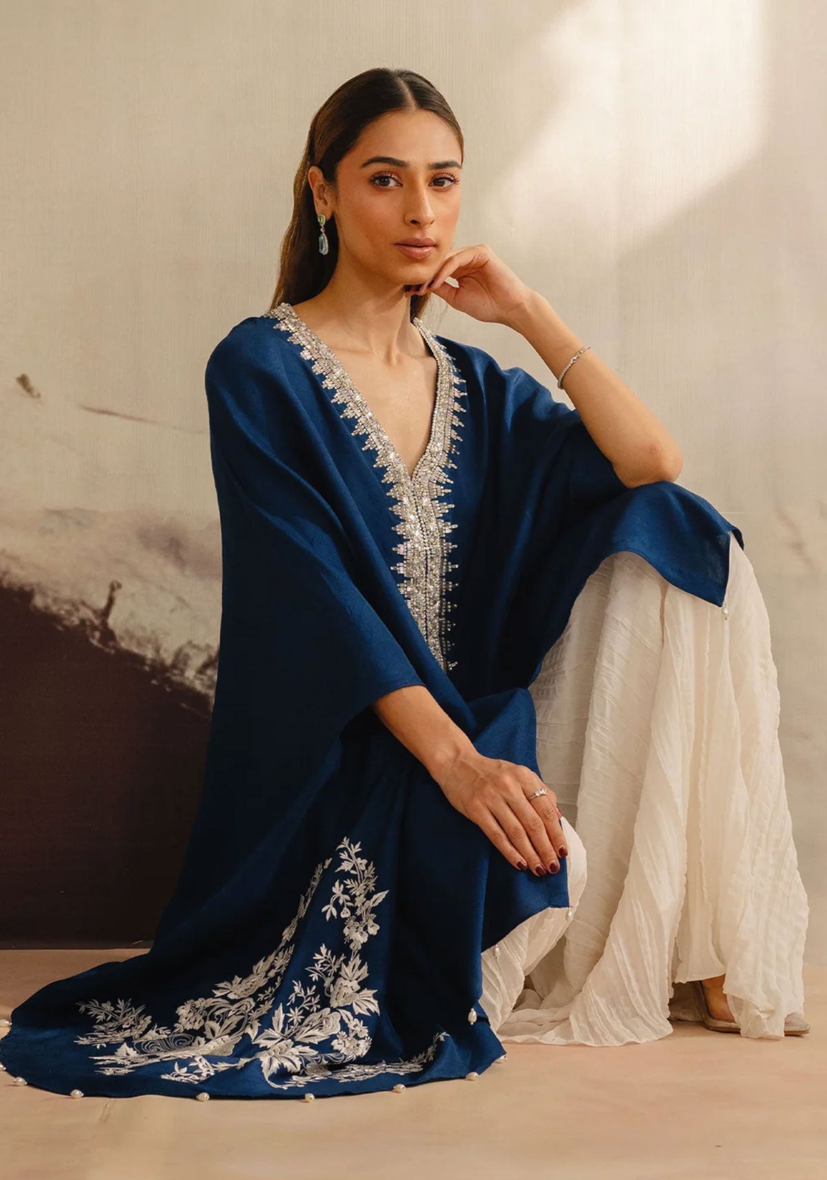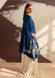 Elevate your wardrobe with Bejewelled Ocean, a midnight blue kurti crafted from premium Korean raw silk. The sleek design is enhanced by the luxurious chiffon sharara, adding a touch of movement and elegance to the ensemble. Perfect for evening soirées, this outfit exudes understated glamour.