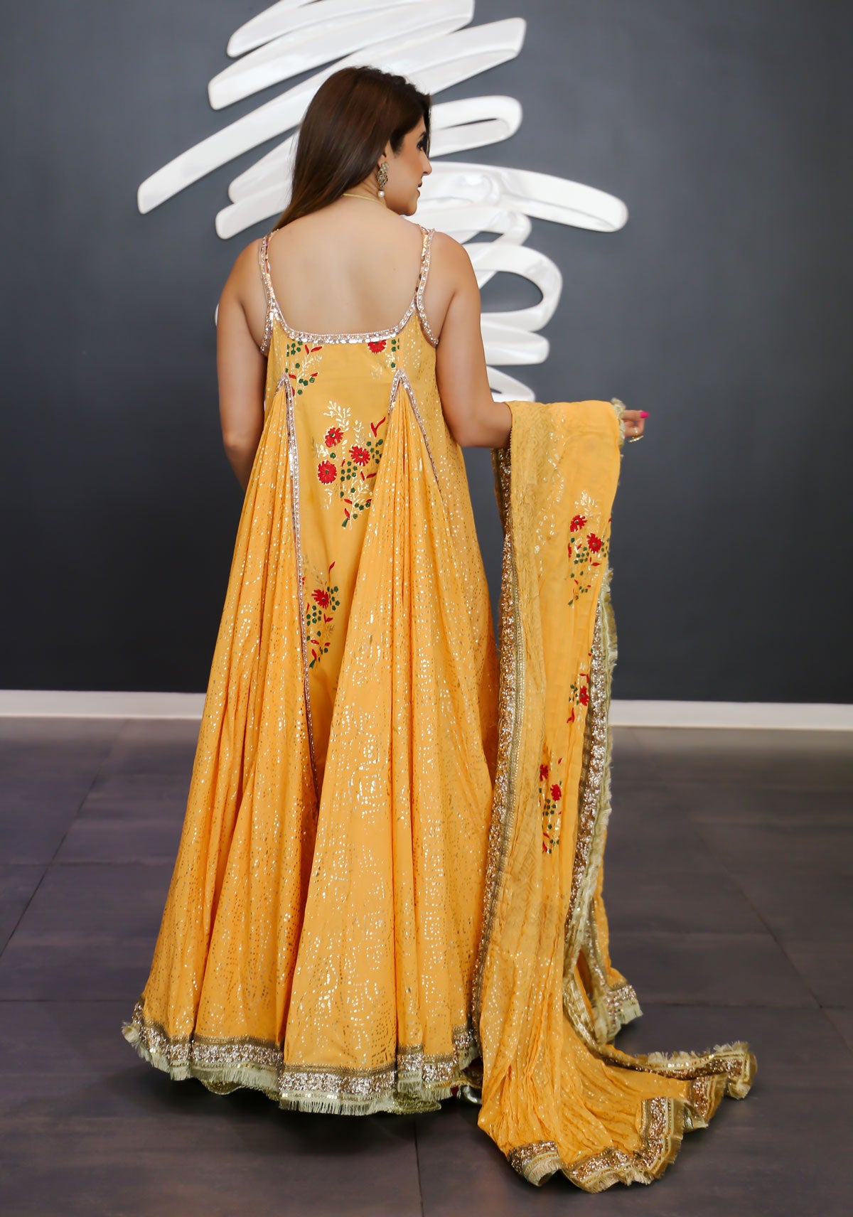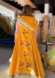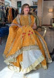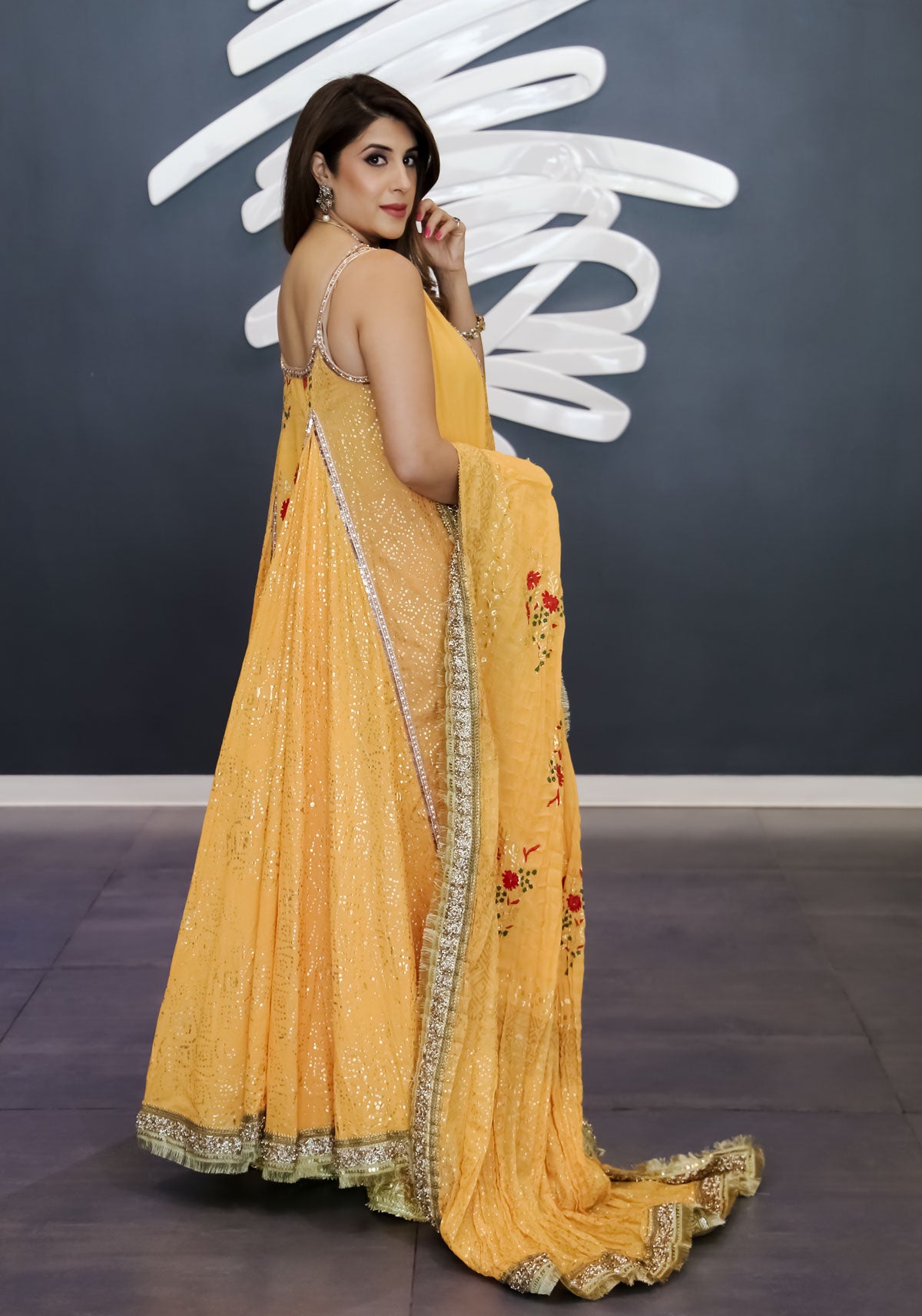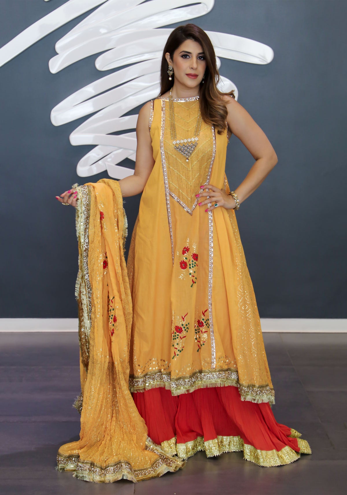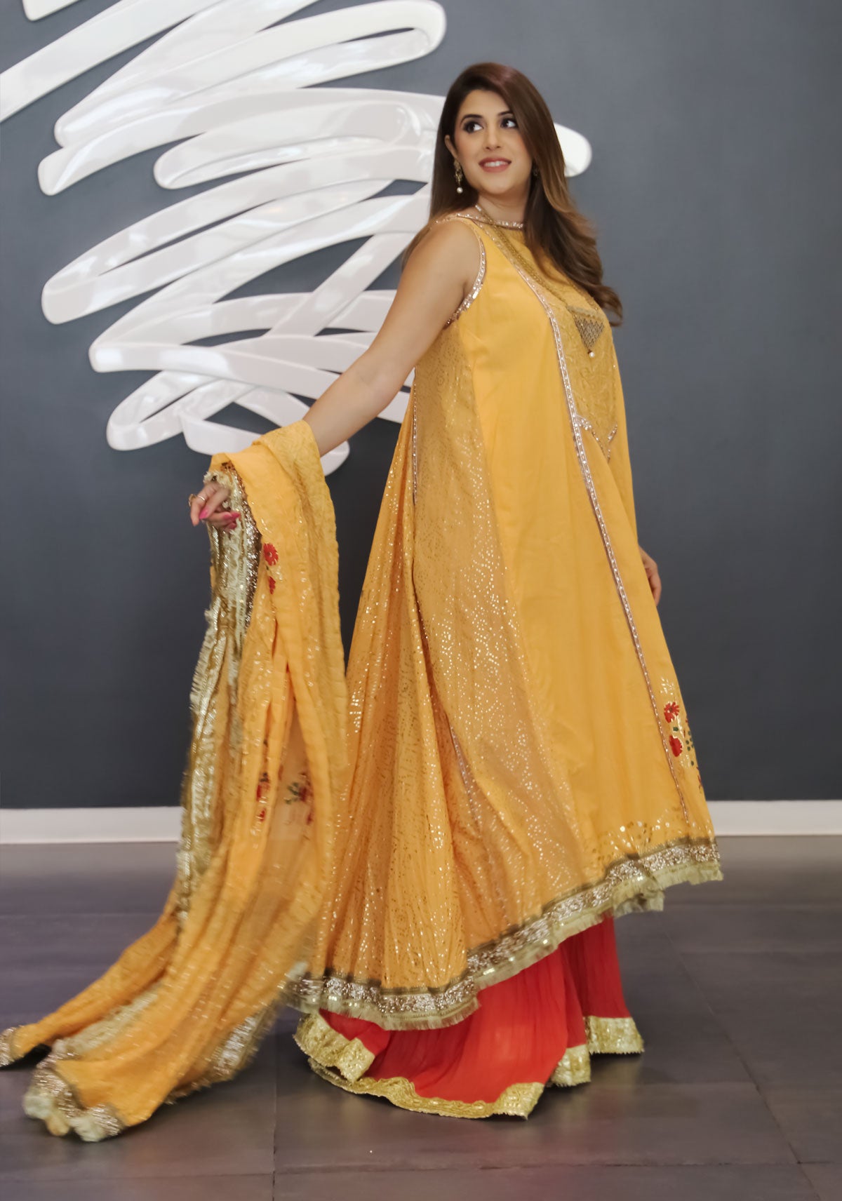 Saffron Yellow malmal Dolphin and dupatta with block and foil print detailing all over with gota finishing.