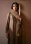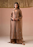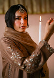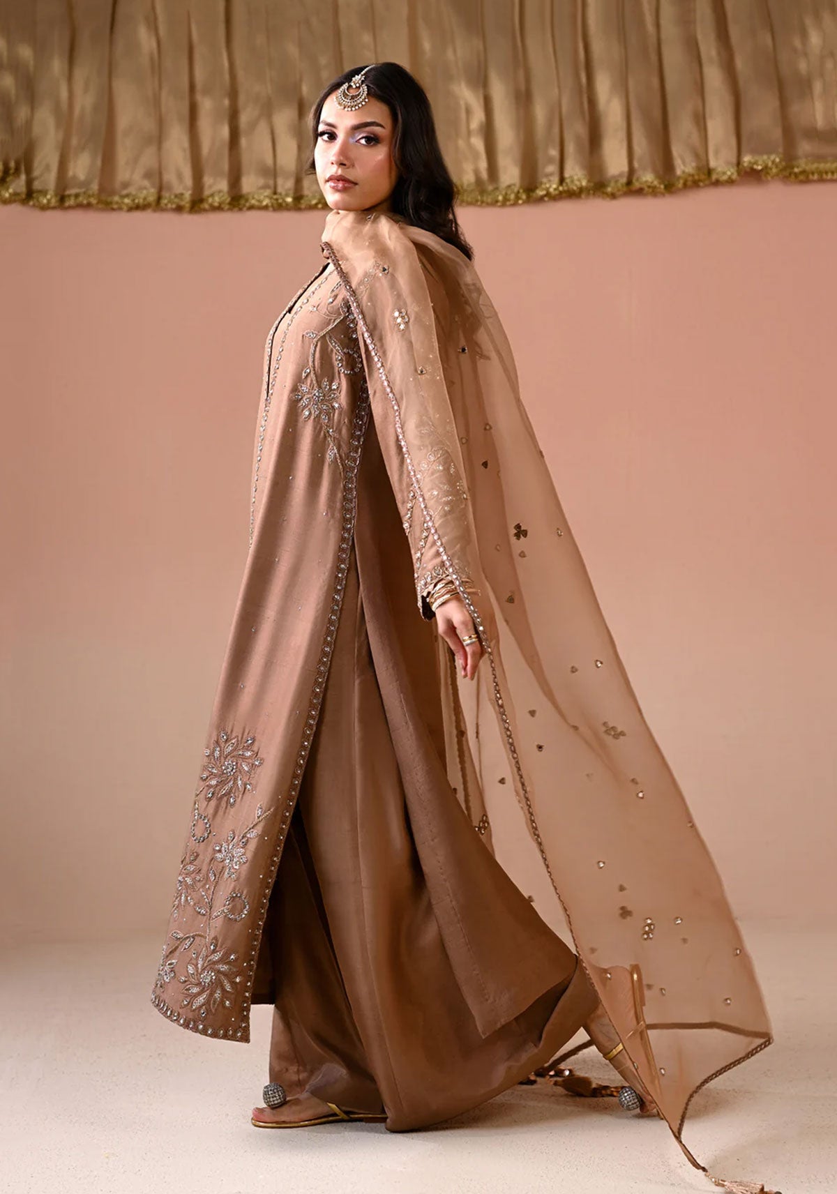 Zaha, as warm and grounding as sunlit earth, is crafted from pure raw silk in a rich shade of brown. The front-open silhouette is adorned with intricate dori work, self-sequins, and silver stones, with delicate sheesha embellishments glistening across the daman and shirt for a subtle yet striking sparkle.