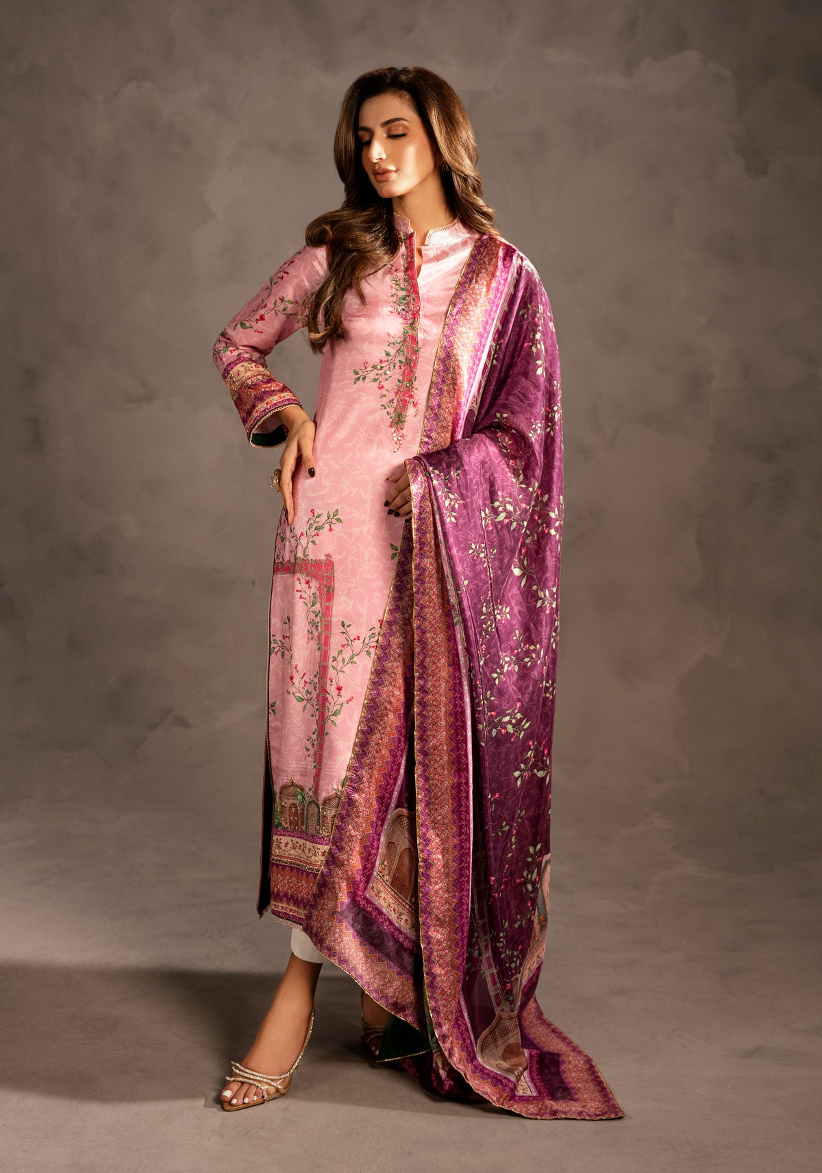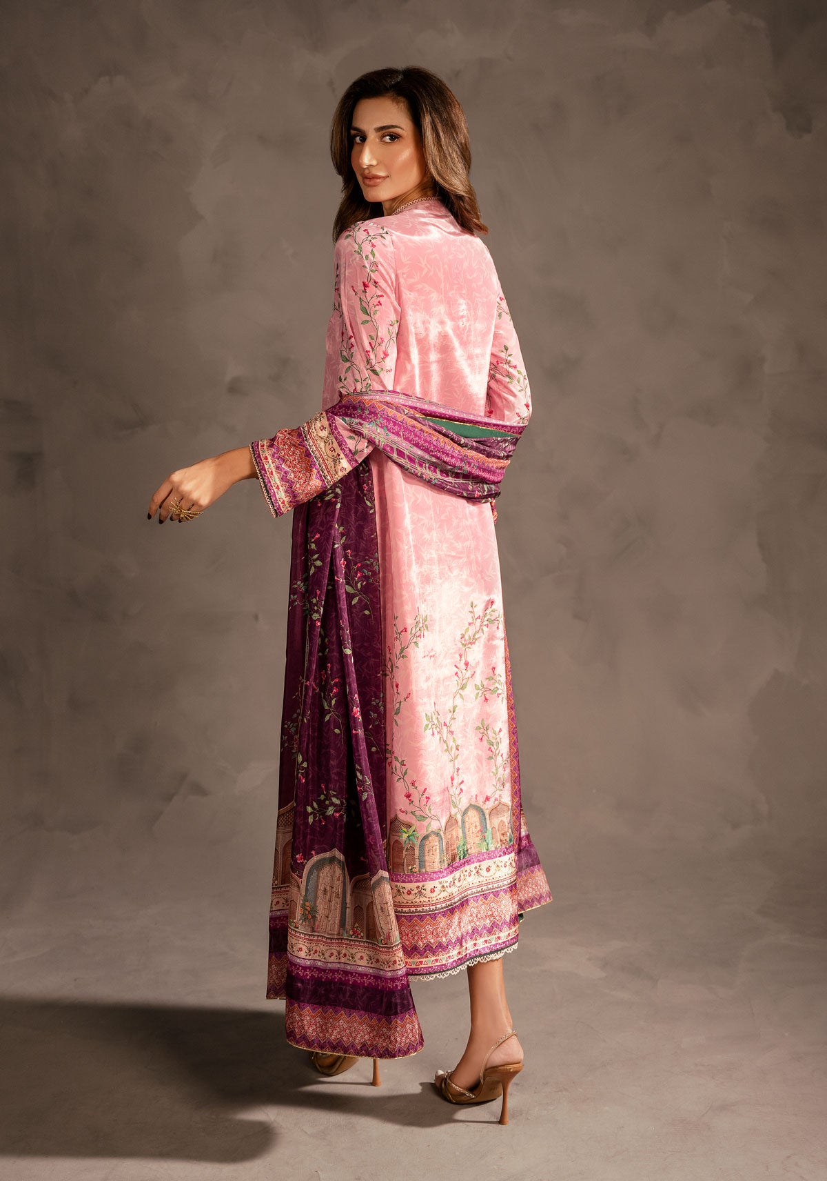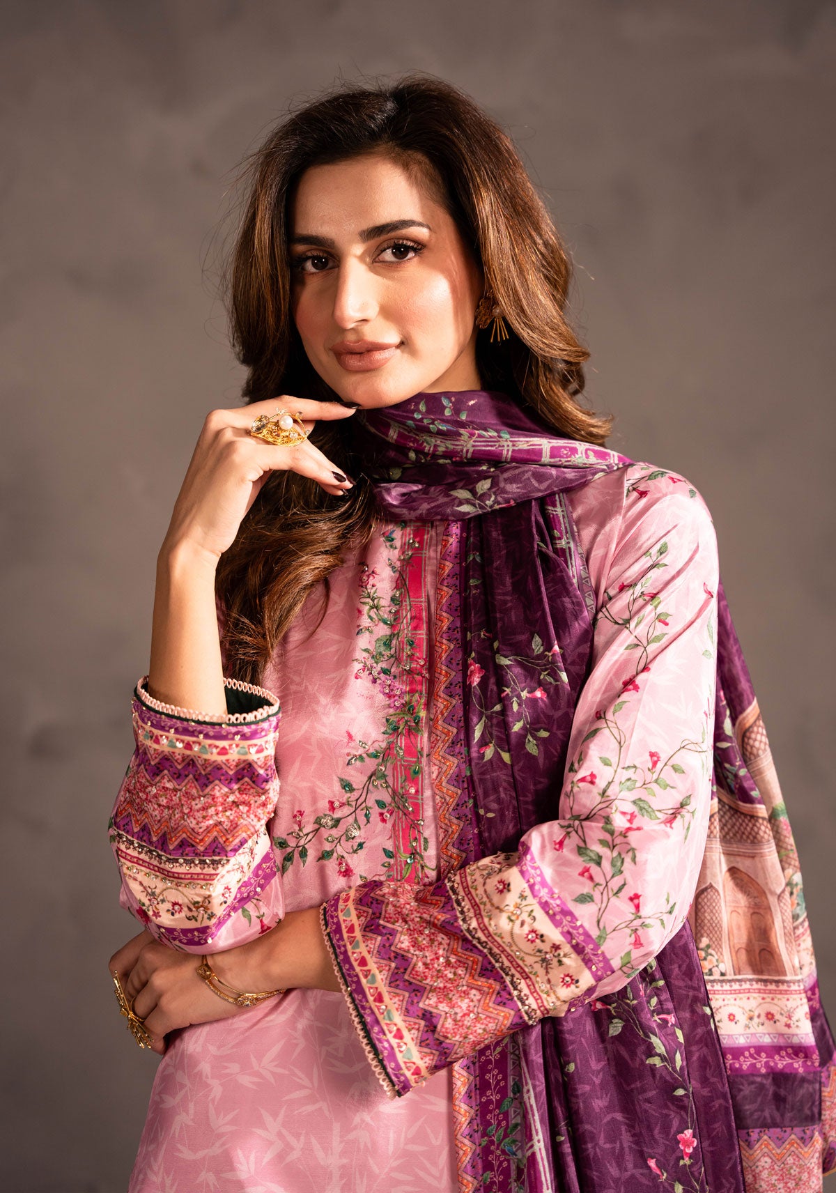 'Floral Oasis" is an exquisitely crafted ensemble that seamlessly blends fresh, spring-inspired prints with traditional design elements. The soft, baby pink base provides an ideal canvas for the delicate interplay of patterns and colors, creating a harmonious visual effect. Hand-embellishments, subtly dispersed across the shirt, lend an air of sophistication and refinement. Intricate lace insertions along the neckline and borders further elevate the design, adding a touch of opulence. The contrasting dupatta, adorned with golden lace detailing, completes the look with a perfect balance of grace and glamour. This outfit is a timeless, elegant choice, making it ideal for any special occasion.