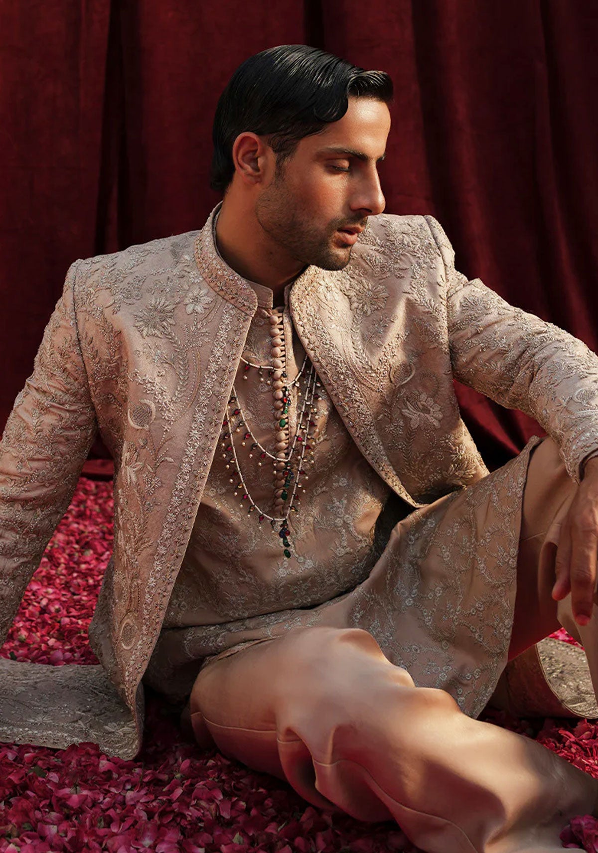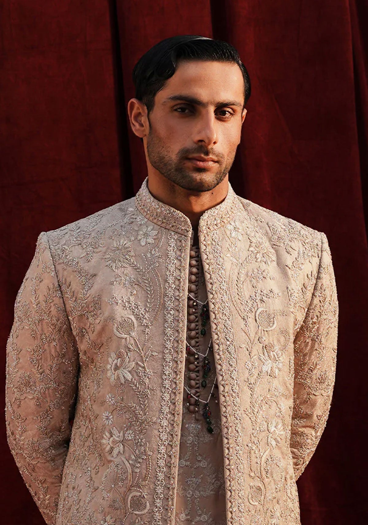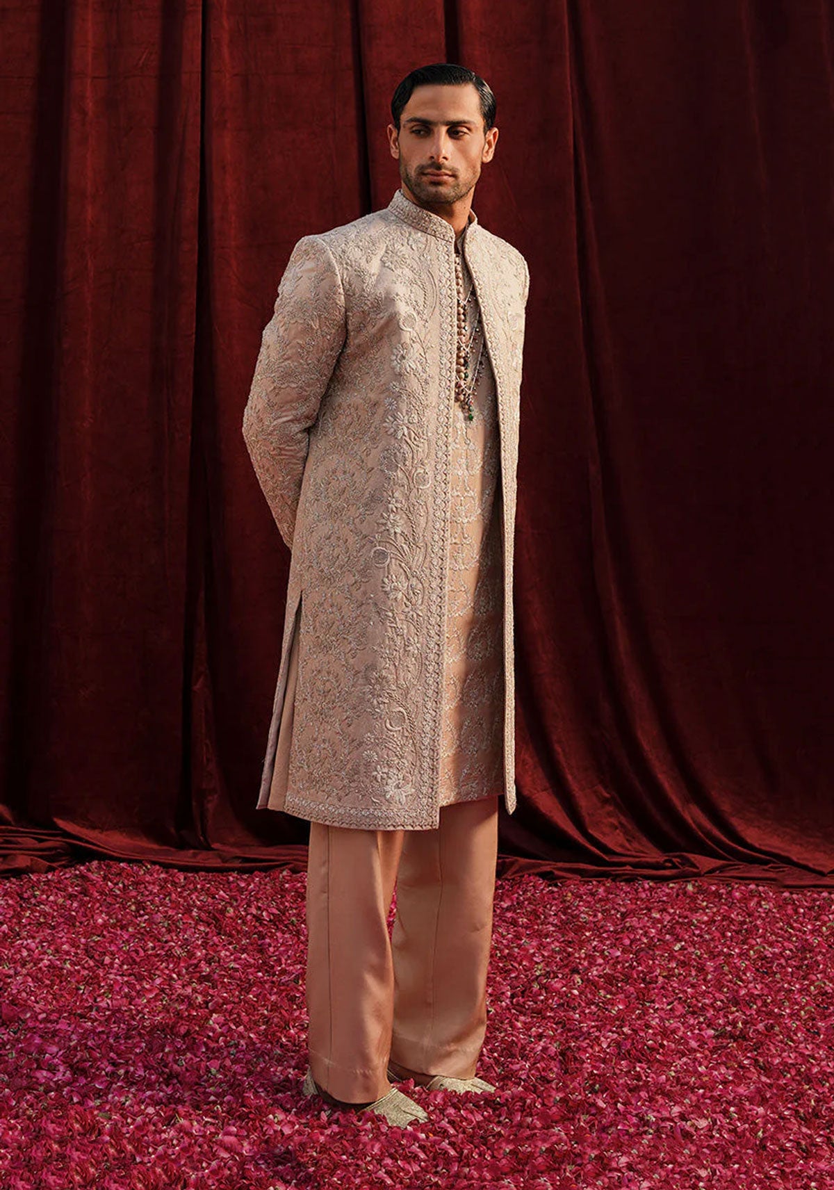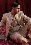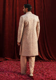 'Champagne pink jacquard front open sherwani, with hand embroidered floral motifs, detailed with tilla and sequin embellishments.