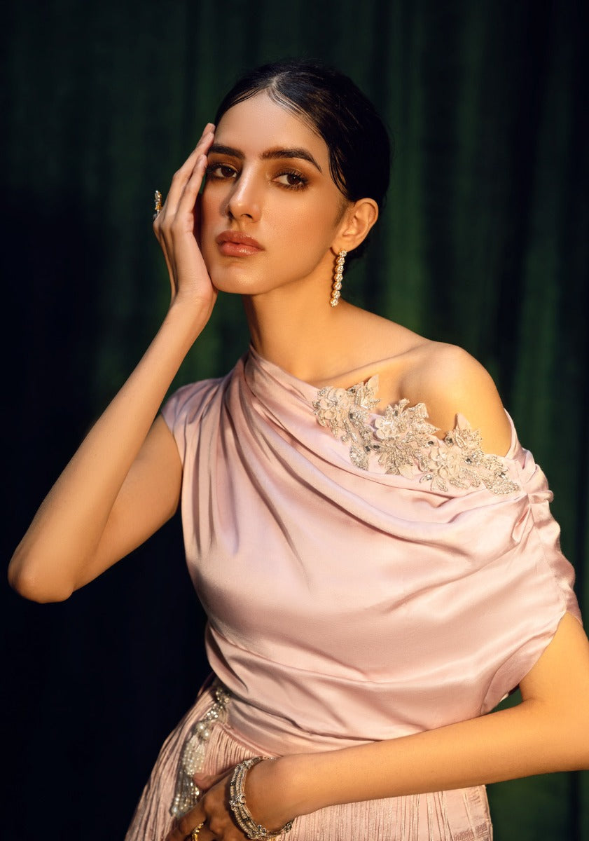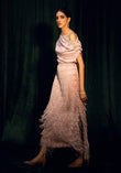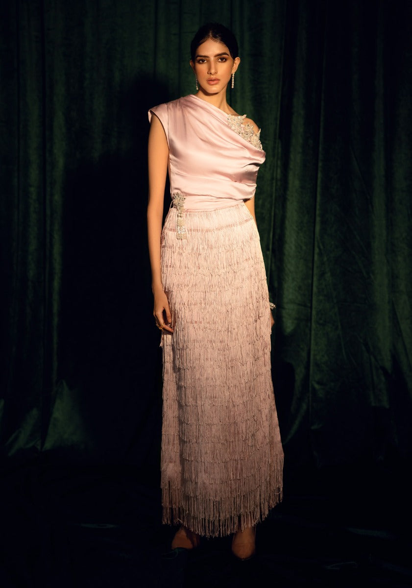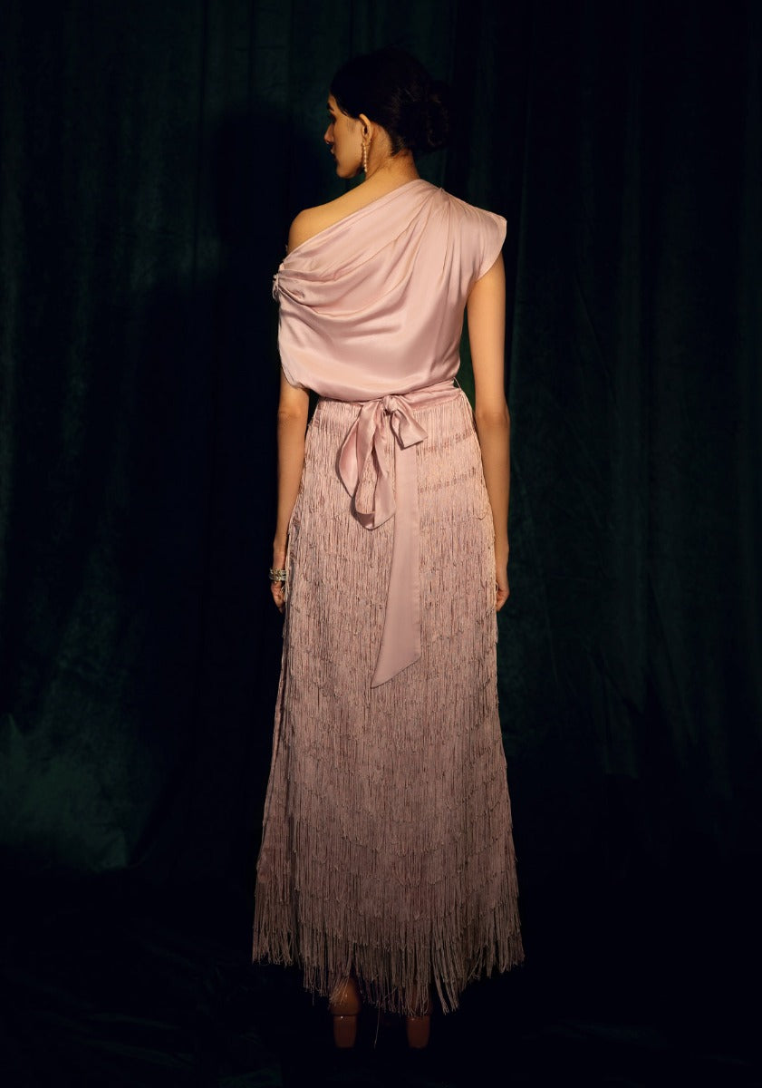 • A powder pink pure satin silk high slit drape dress with a cowl neckline and embellished motif