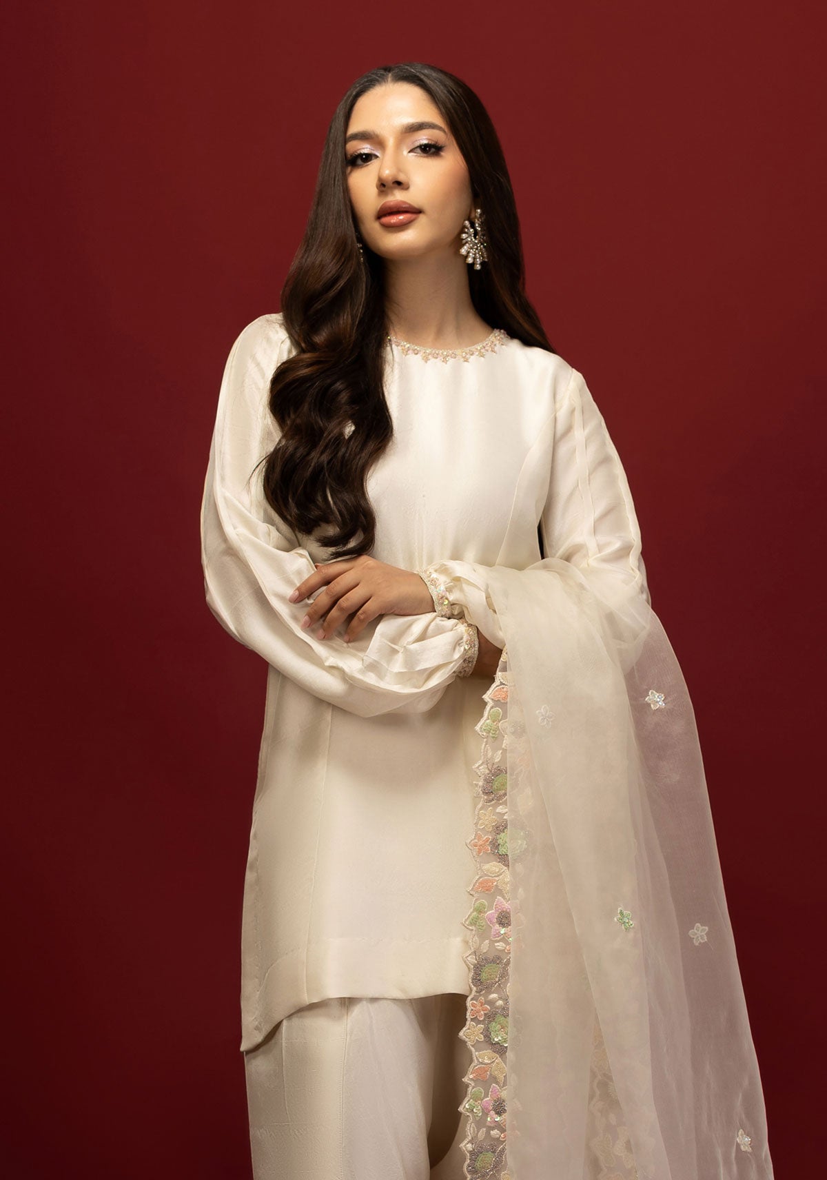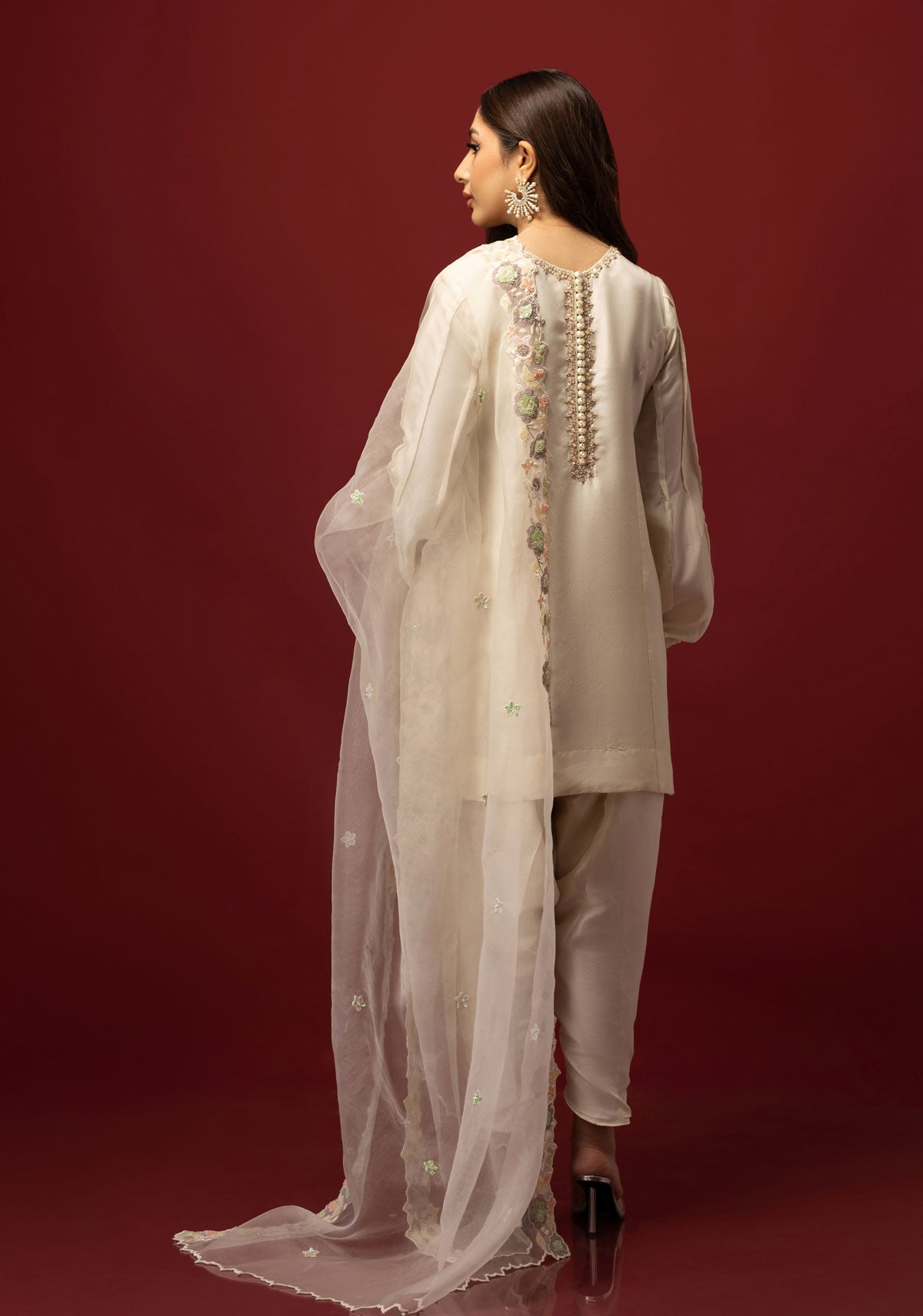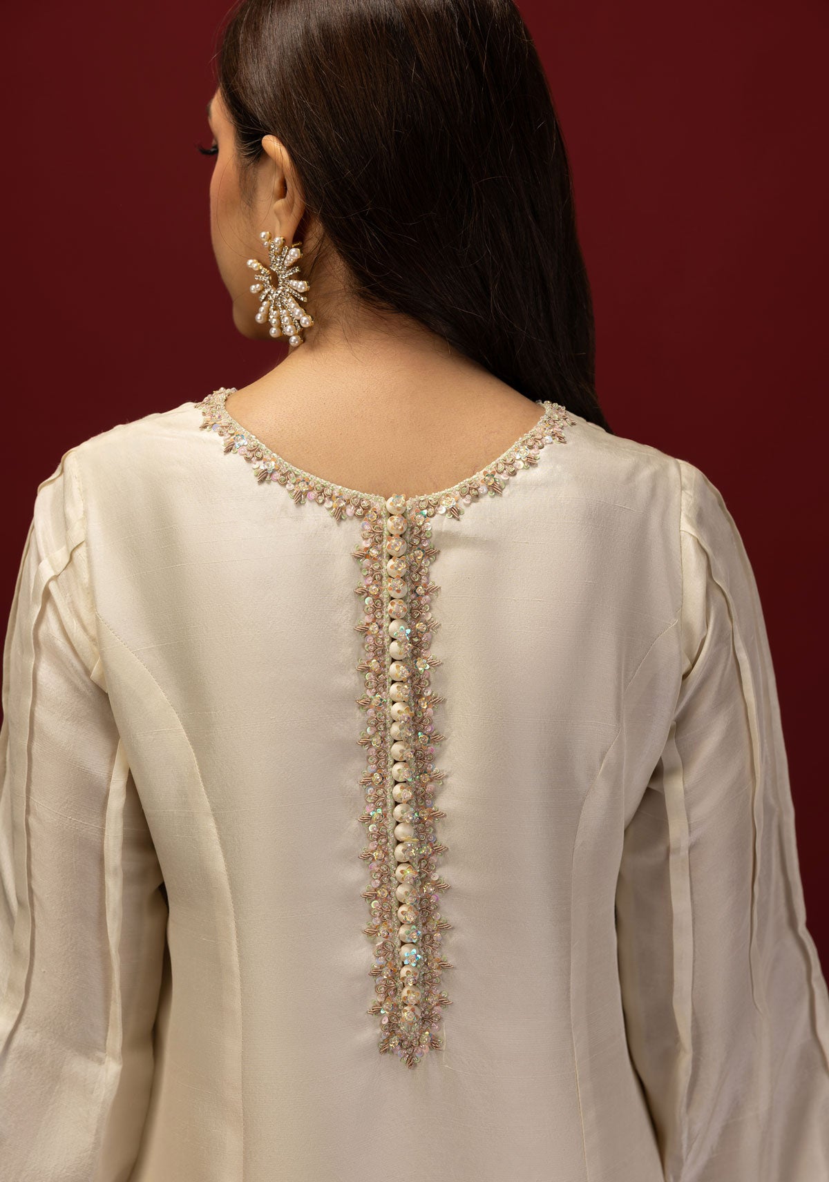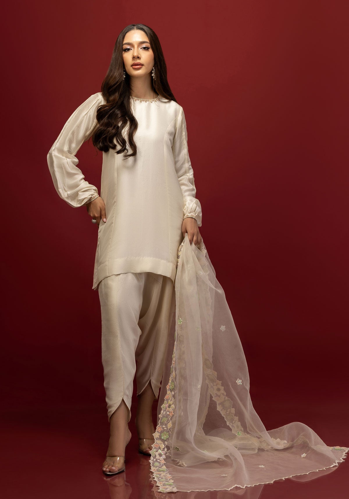 'How absolutely stunning is this outfit. Introducing Zoe in this beautiful ivory. This silhouette is cut from the finest fabrics with statement sleeves and delicate handwork on the neckline, with our statement back design detailing with hand worked buttons. Paired with a modern-cut tulip shalwar to complete the look. Standard shirt length is 34 inches.