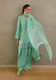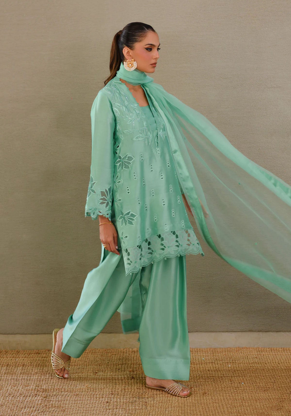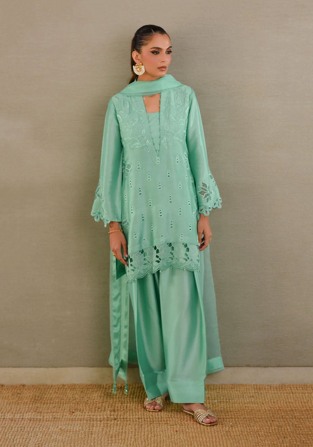 Paired with a matching pure silk farshi shalwar and a sheer organza dupatta, delicately sprayed with pearls and finished with tassels along the border, this ensemble is a poetic ode to elegance-crafted for an Eid celebration filled with grace and timeless charm.