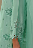 Zohal captures the serenity of ocean waves kissed by morning light-a gentle symphony of calm and shimmer. The silhouette features a V neckline adorned with delicate crystal embroidery, pearl accents, and glistening stones. Cut work floral motifs, embellished with cut dana and radiant crystals, flow effortlessly across the outfit, while the daman is framed with intricate cut work lace that adds depth and finesse.